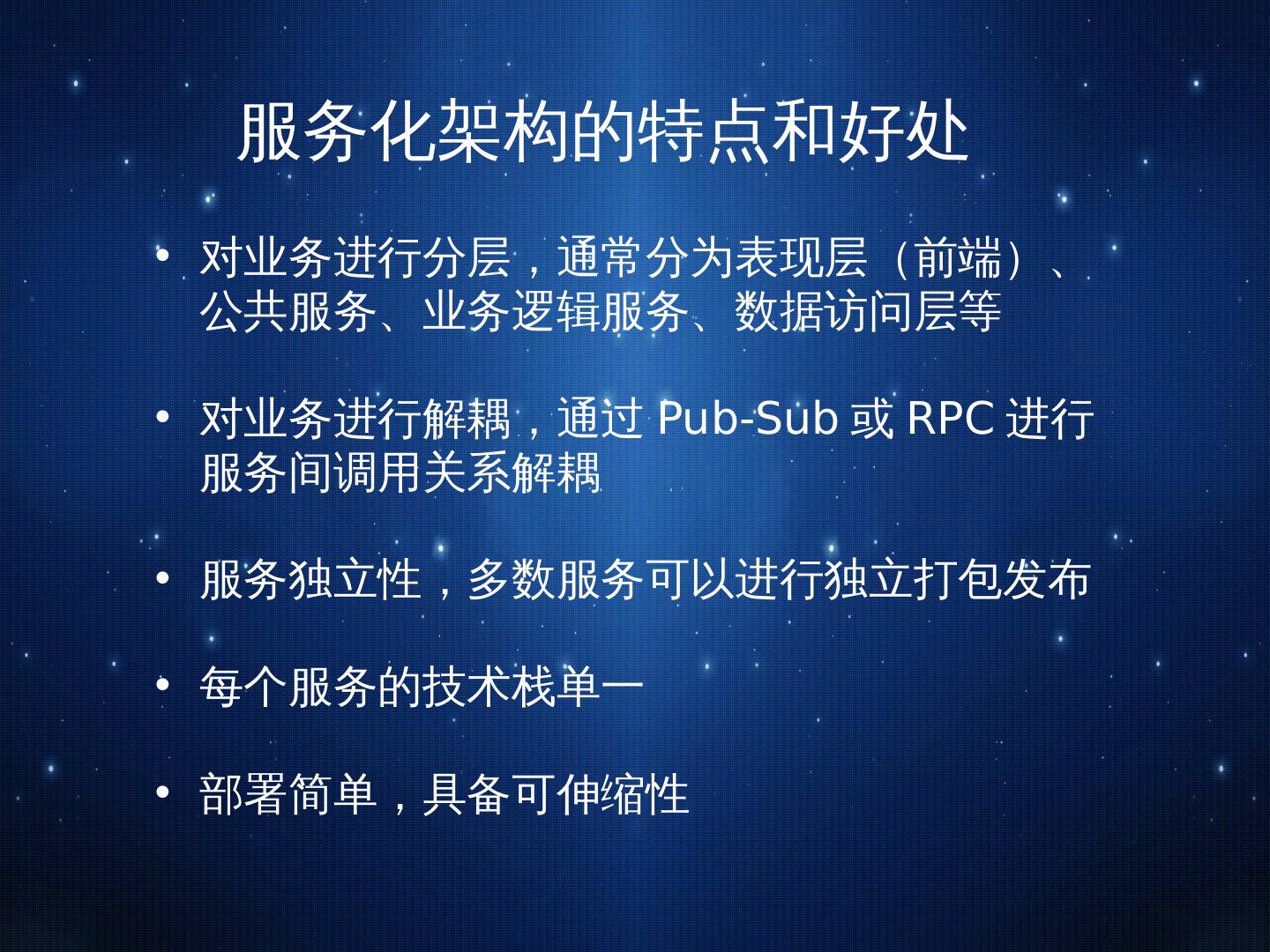 8 .对业务进行分层,通常分为表现层(前端)、公共服务、业务逻辑服务、数据访问层等 对业务进行解耦,通过 Pub-Sub 或 RPC 进行服务间调用关系解耦 服务独立性,多数服务可以进行独立打包发布 每个服务的技术栈单一 部署简单,具备可伸缩性 服务化架构的特点和好处