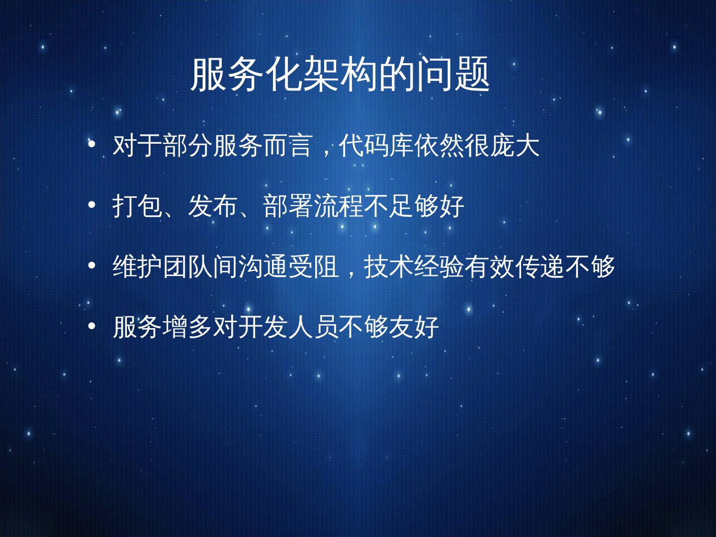 9 .对于部分服务而言,代码库依然很庞大 打包、发布、部署流程不足够好 维护团队间沟通受阻,技术经验有效传递不够 服务增多对开发人员不够友好 服务化架构的问题
