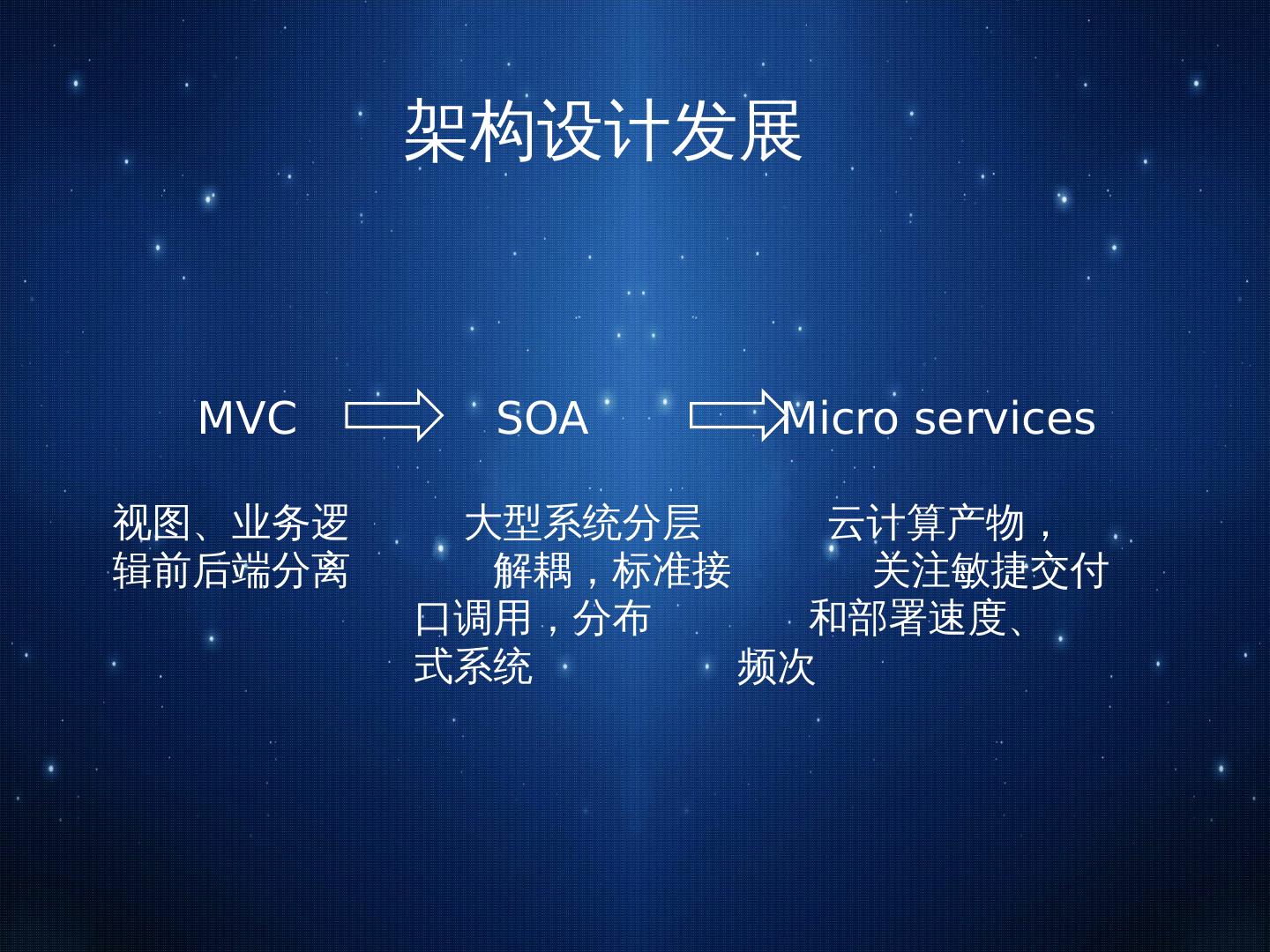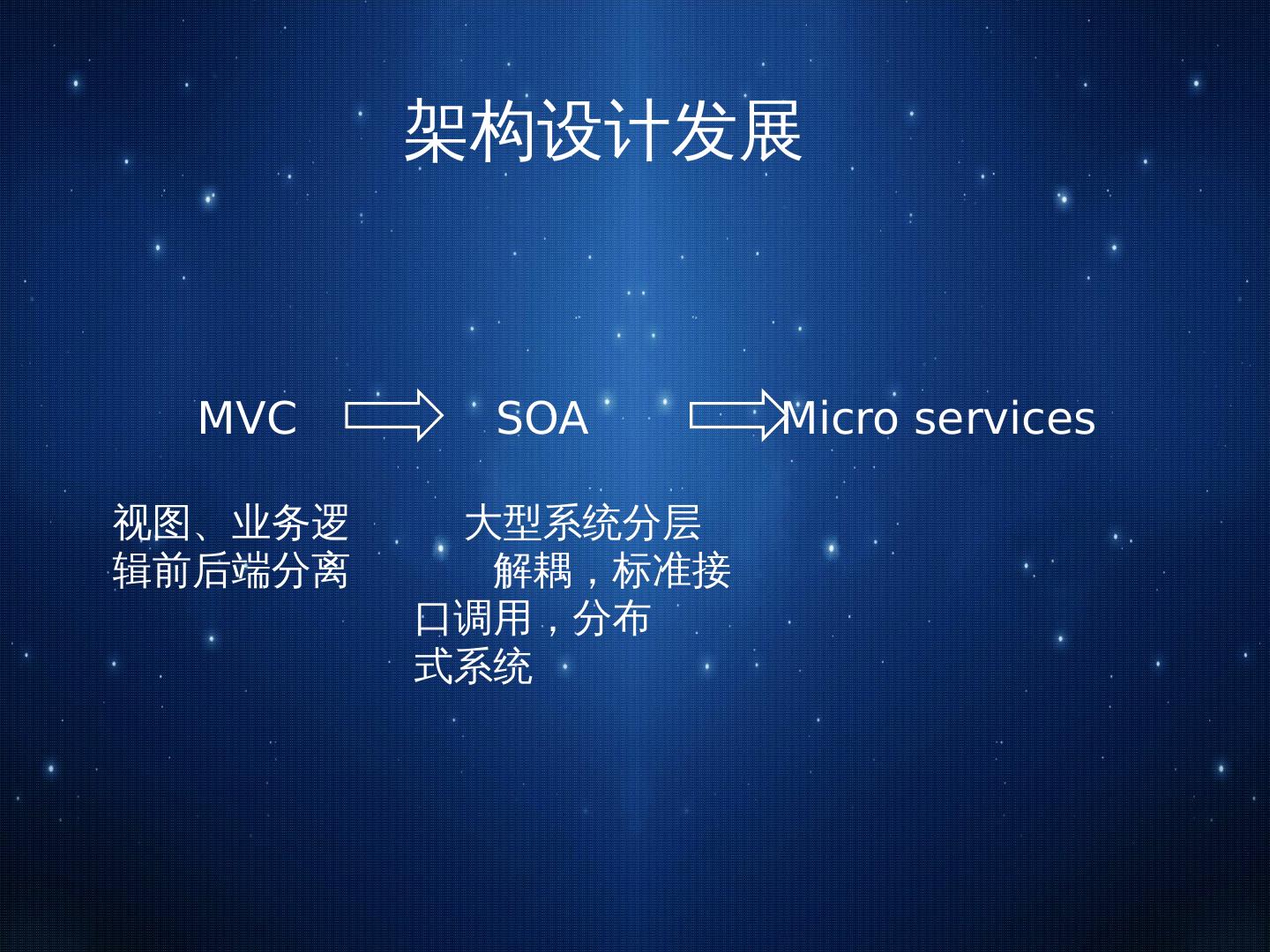 13 . MVC SOA Micro services 视图、业务逻 大型系统分层 辑前后端分离 解耦,标准接 口调用,分布 式系统 架构设计发展