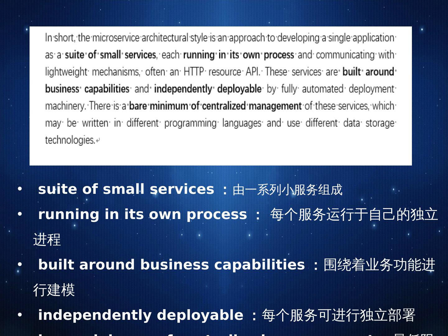 16 . suite of small services : 由一系列小服务组成 running in its own process : 每个服务运行于自己的独立进程 built around business capabilities : 围绕着业务功能进行建模 independently deployable : 每个服务可进行独立部署 bare minimum of centralized management : 最低限度集中种管理