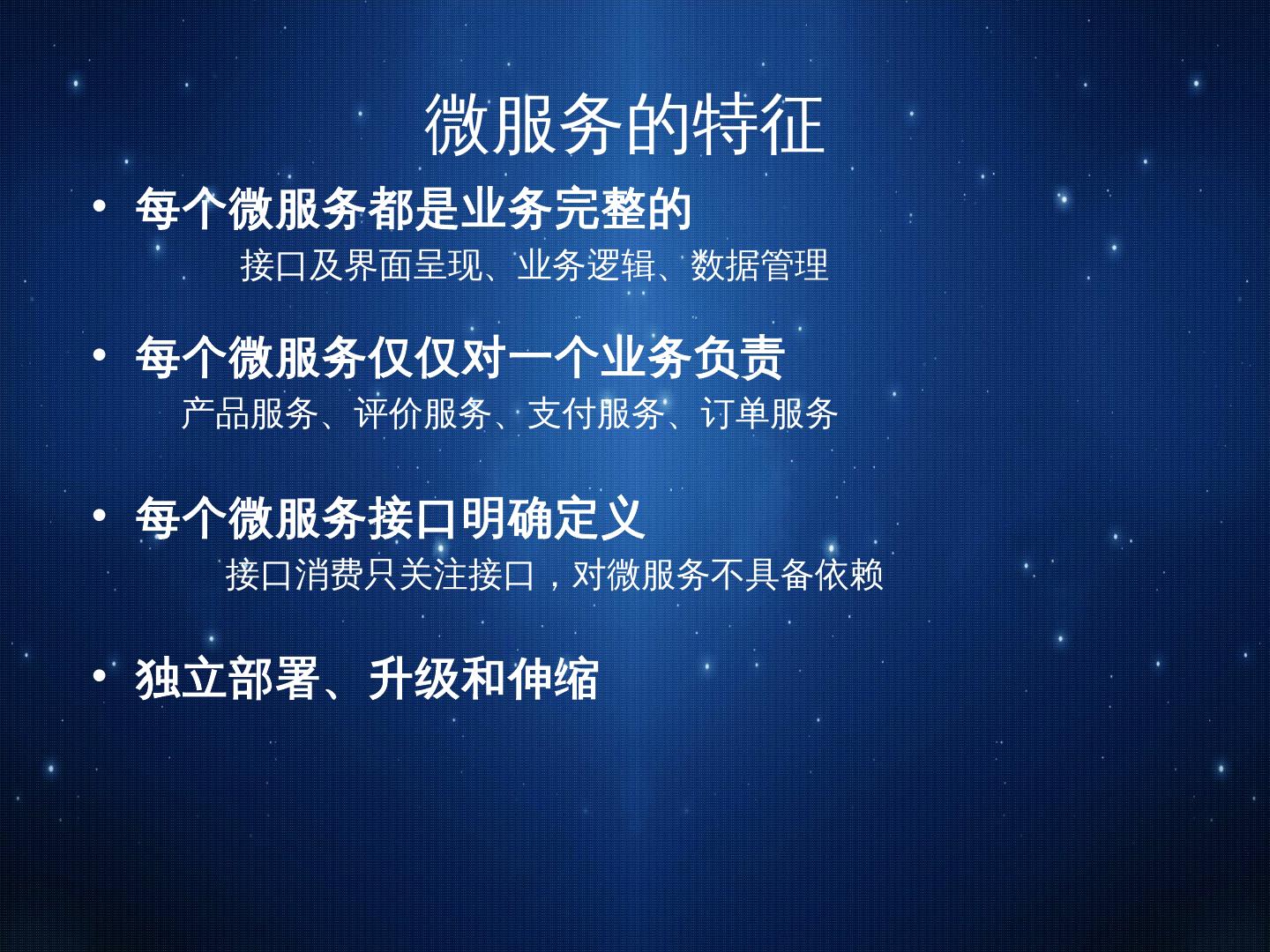 17 .微服务的特征 每个微服务都是业务完整的 接口及界面呈现、业务逻辑、数据管理 每个微服务仅仅对一个业务负责 产品服务、评价服务、支付服务、订单服务 每个微服务接口明确定义 接口消费只关注接口,对微服务不具备依赖 独立部署、升级和伸缩