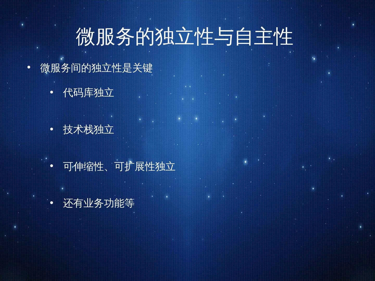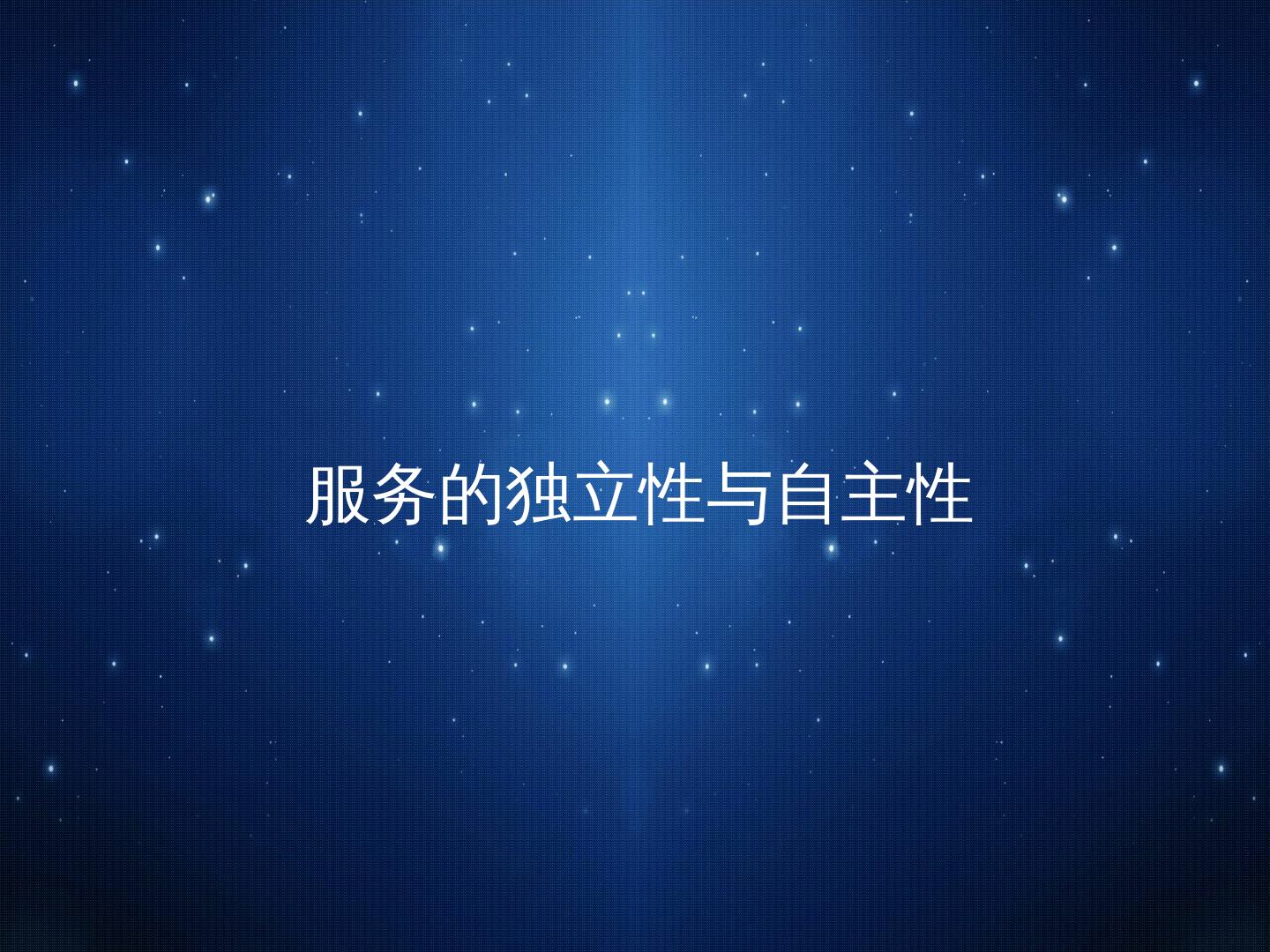19 .微服务的独立性与自主性 微服务间的独立性是关键 代码库独立 技术栈独立 可伸缩性、可扩展性独立 还有业务功能等