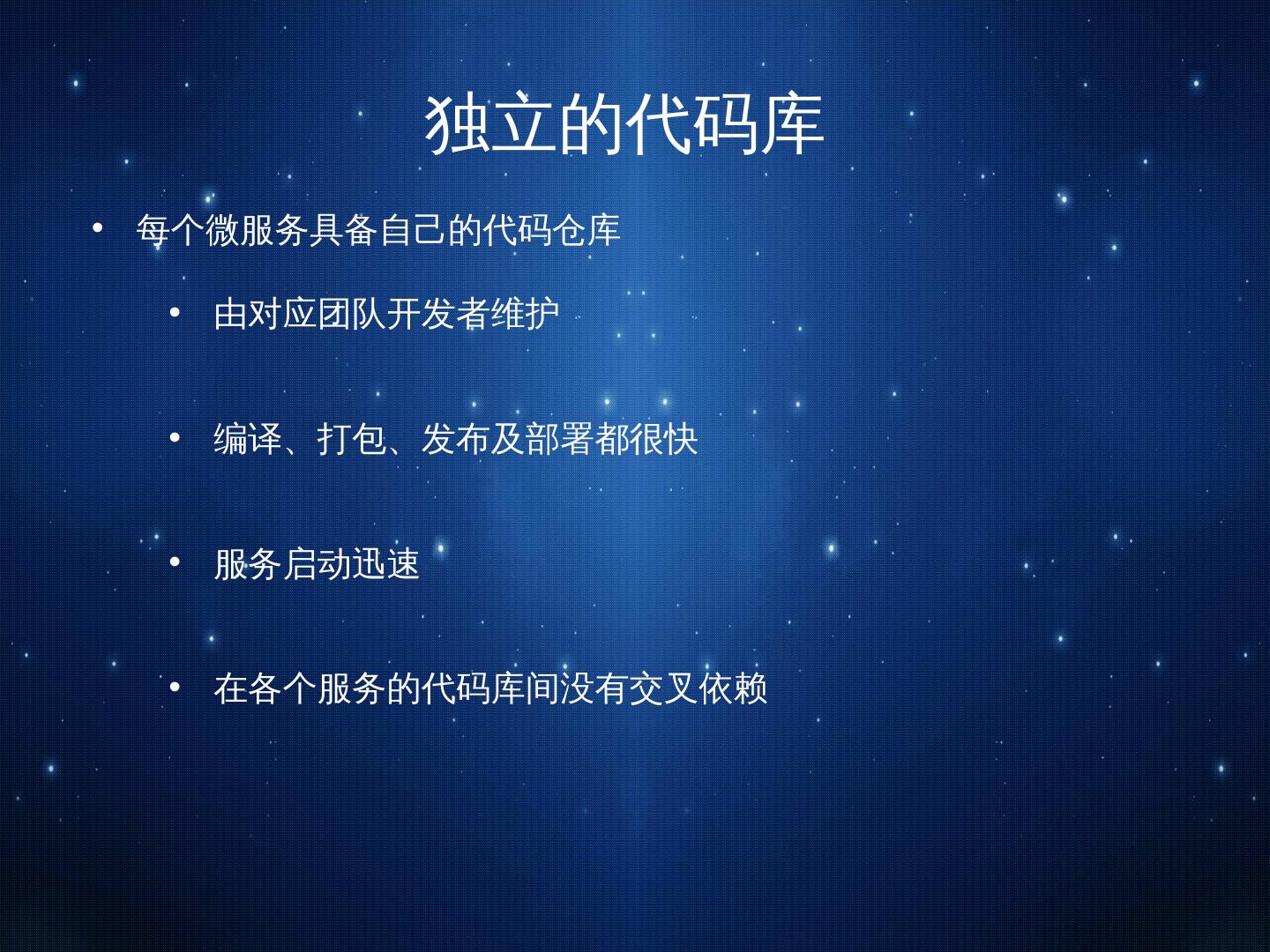 20 .独立的代码库 每个微服务具备自己的代码仓库 由对应团队开发者维护 编译、打包、发布及部署都很快 服务启动迅速 在各个服务的代码库间没有交叉依赖