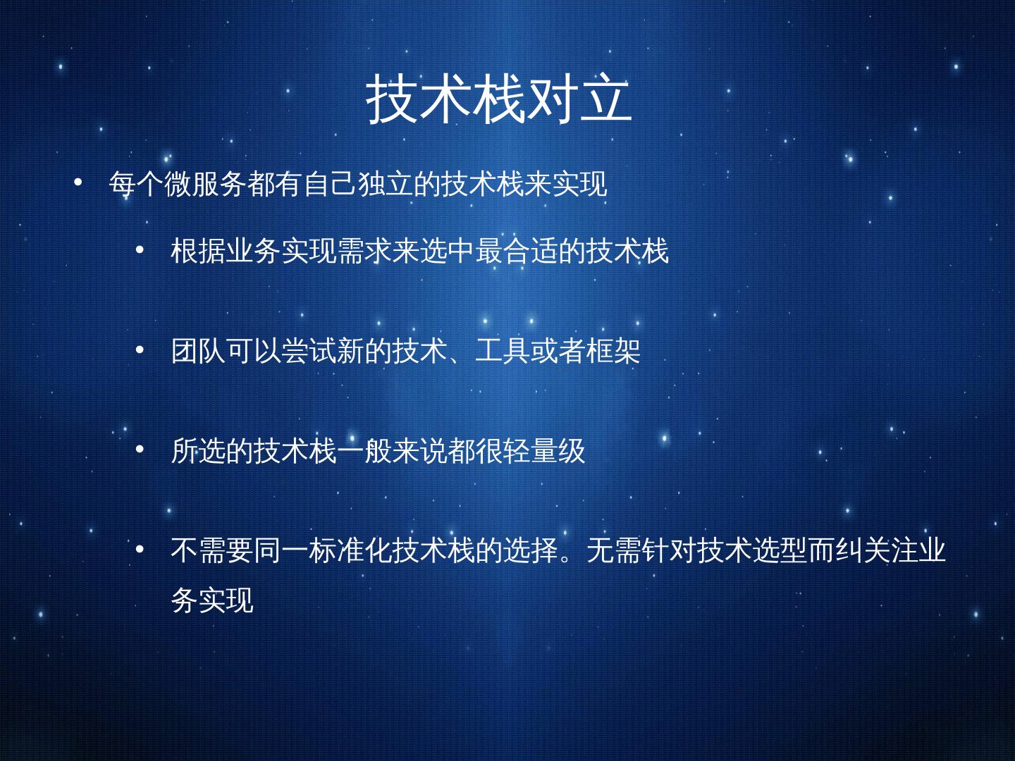 21 .技术栈对立 每个微服务都有自己独立的技术栈来实现 根据业务实现需求来选中最合适的技术栈 团队可以尝试新的技术、工具或者框架 所选的技术栈一般来说都很轻量级 不需要同一标准化技术栈的选择。无需针对技术选型而纠关注业务实现