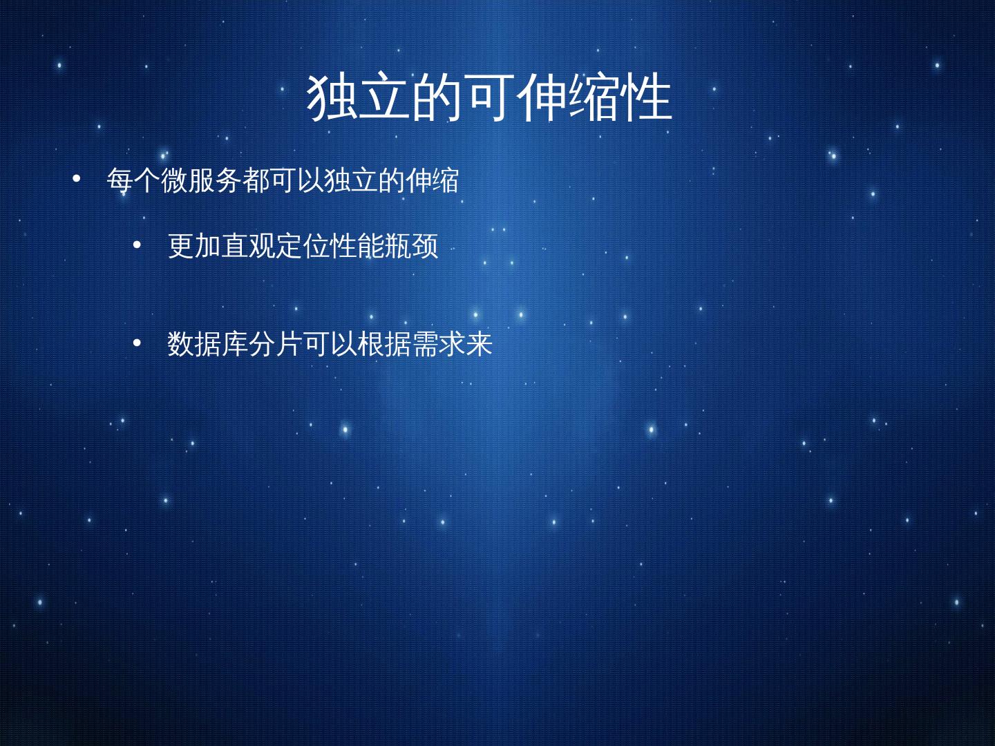 22 .独立的可伸缩性 每个微服务都可以独立的伸缩 更加直观定位性能瓶颈 数据库分片可以根据需求来