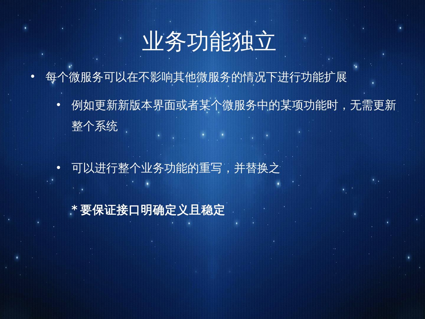 23 .业务功能独立 每个微服务可以在不影响其他微服务的情况下进行功能扩展 例如更新新版本界面或者某个微服务中的某项功能时,无需更新整个系统 可以进行整个业务功能的重写,并替换之 *要保证接口明确定义且稳定