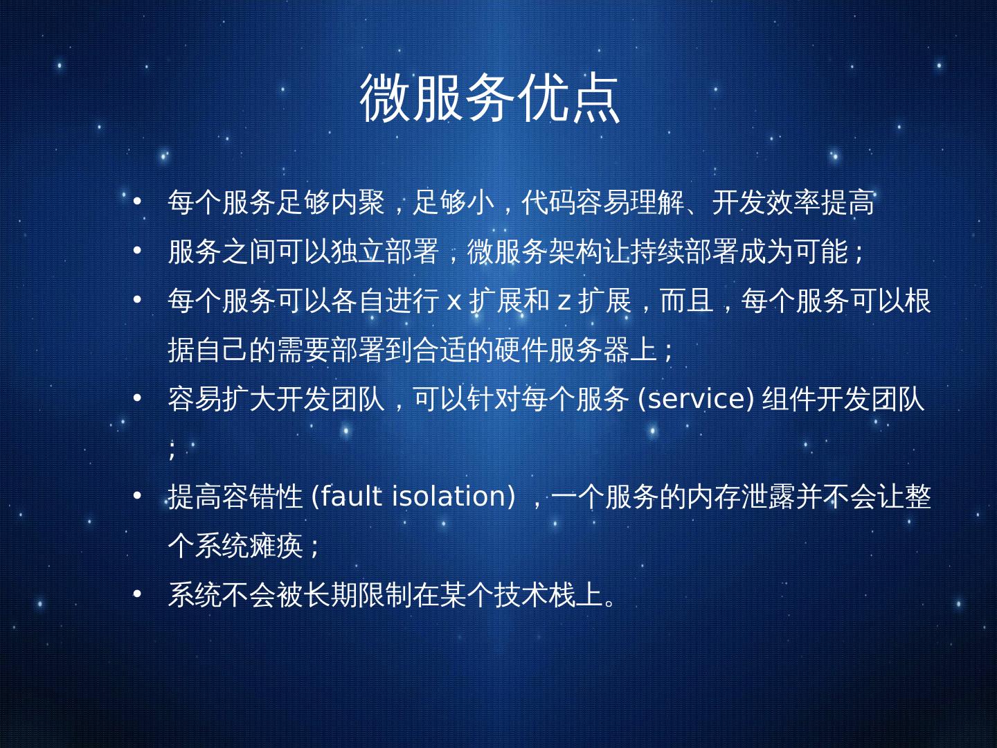 24 .微服务优点 每个服务足够内聚,足够小,代码容易理解、开发效率提高 服务之间可以独立部署,微服务架构让持续部署成为可能 ; 每个服务可以各自进行 x 扩展和 z 扩展,而且,每个服务可以根据自己的需要部署到合适的硬件服务器上 ; 容易扩大开发团队,可以针对每个服务 (service) 组件开发团队 ; 提高容错性 (fault isolation) ,一个服务的内存泄露并不会让整个系统瘫痪 ; 系统不会被长期限制在某个技术栈上。