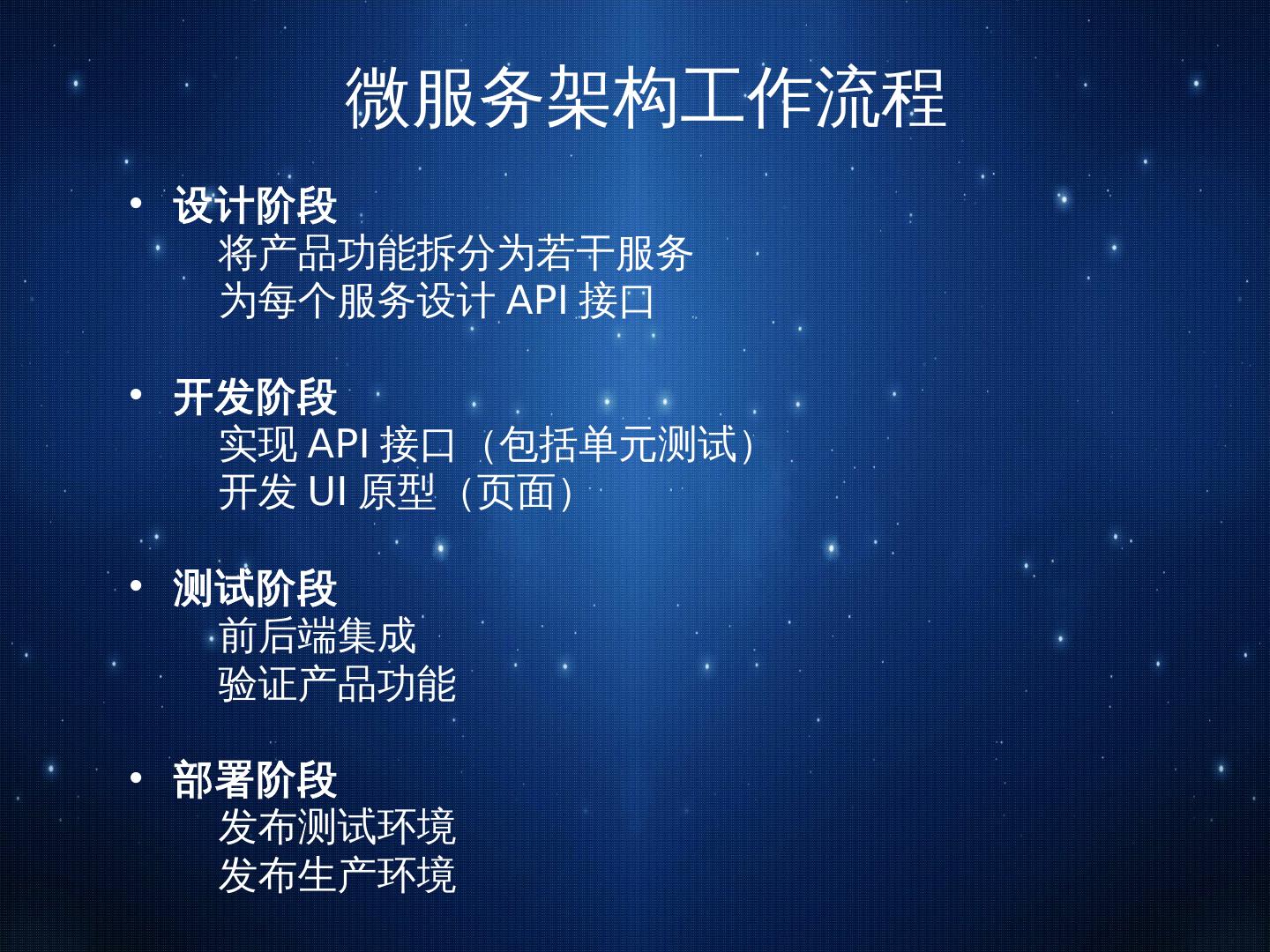 27 .微服务架构工作流程 设计阶段 将产品功能拆分为若干服务 为每个服务设计 API 接口 开发阶段 实现 API 接口(包括单元测试) 开发 UI 原型(页面) 测试阶段 前后端集成 验证产品功能 部署阶段 发布测试环境 发布生产环境