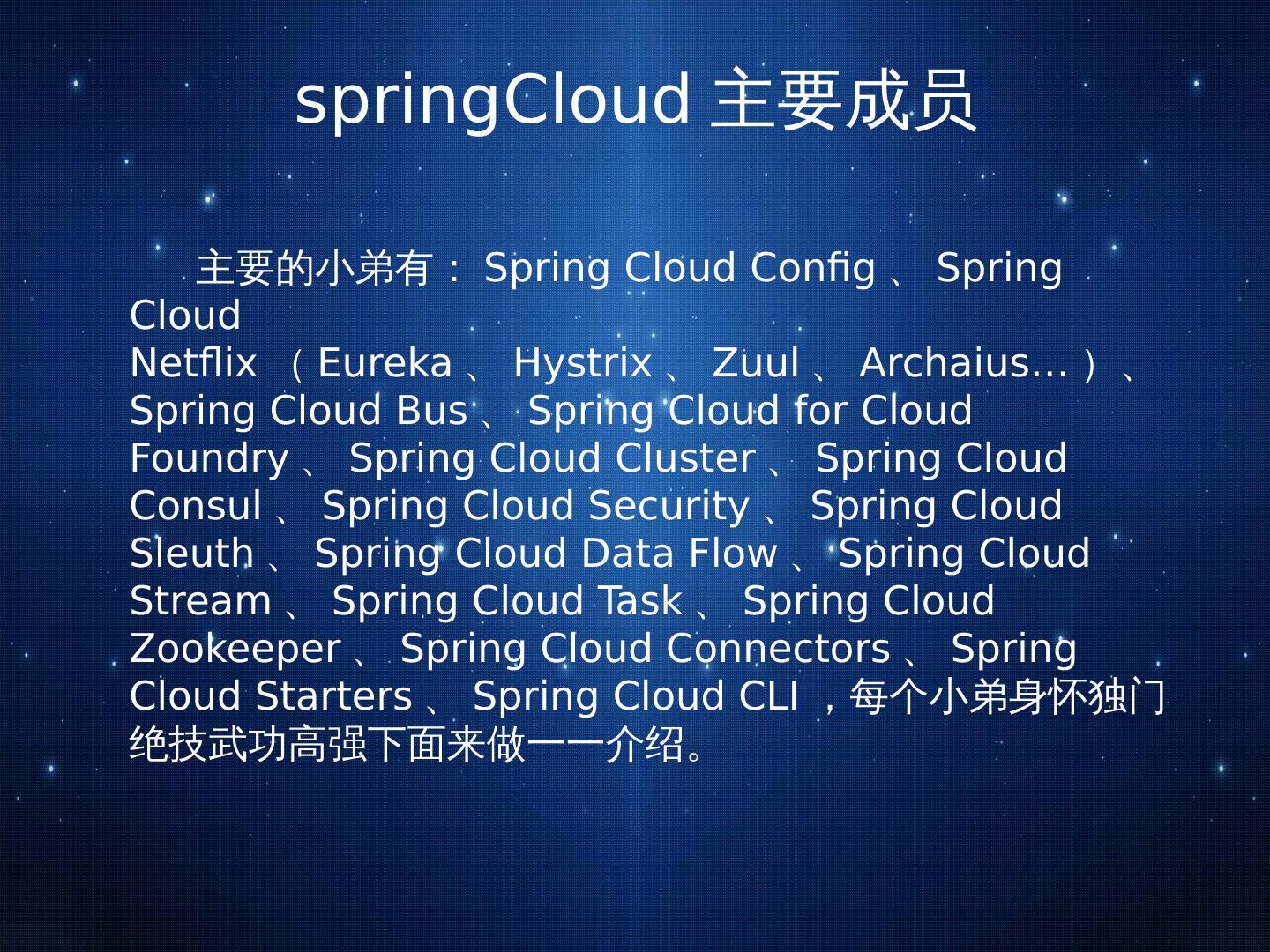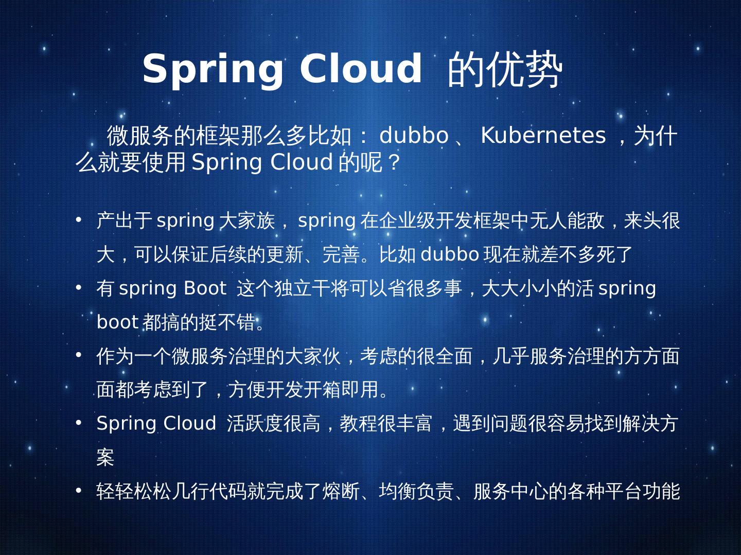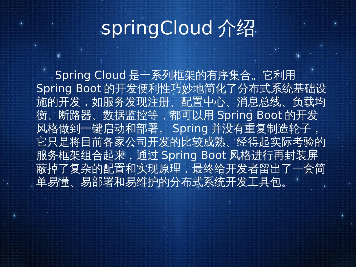 29 .springCloud 介绍 Spring Cloud 是一系列框架的有序集合。它利用 Spring Boot 的开发便利性巧妙地简化了分布式系统基础设施的开发,如服务发现注册、配置中心、消息总线、负载均衡、断路器、数据监控等,都可以用 Spring Boot 的开发风格做到一键启动和部署。 Spring 并没有重复制造轮子,它只是将目前各家公司开发的比较成熟、经得起实际考验的服务框架组合起来,通过 Spring Boot 风格进行再封装屏蔽掉了复杂的配置和实现原理,最终给开发者留出了一套简单易懂、易部署和易维护的分布式系统开发工具包。