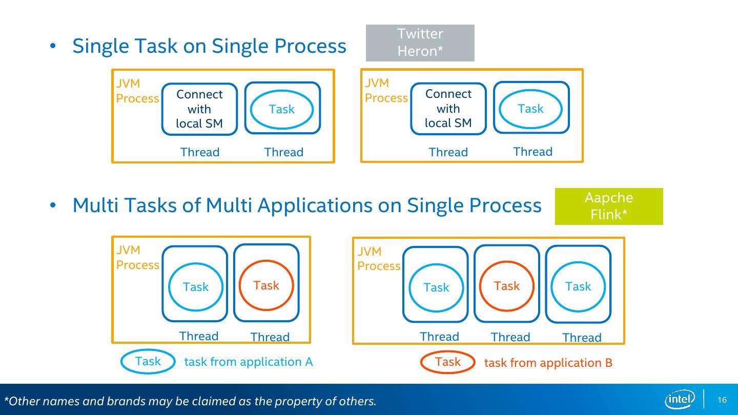 16 . Twitter • Single Task on Single Process Heron* JVM JVM Process Connect Process Connect with Task with Task local SM local SM Thread Thread Thread Thread Aapche • Multi Tasks of Multi Applications on Single Process Flink* JVM JVM Process Process Task Task Task Task Task Thread Thread Thread Thread Thread Task task from application A Task task from application B *Other names and brands may be claimed as the property of others. 16