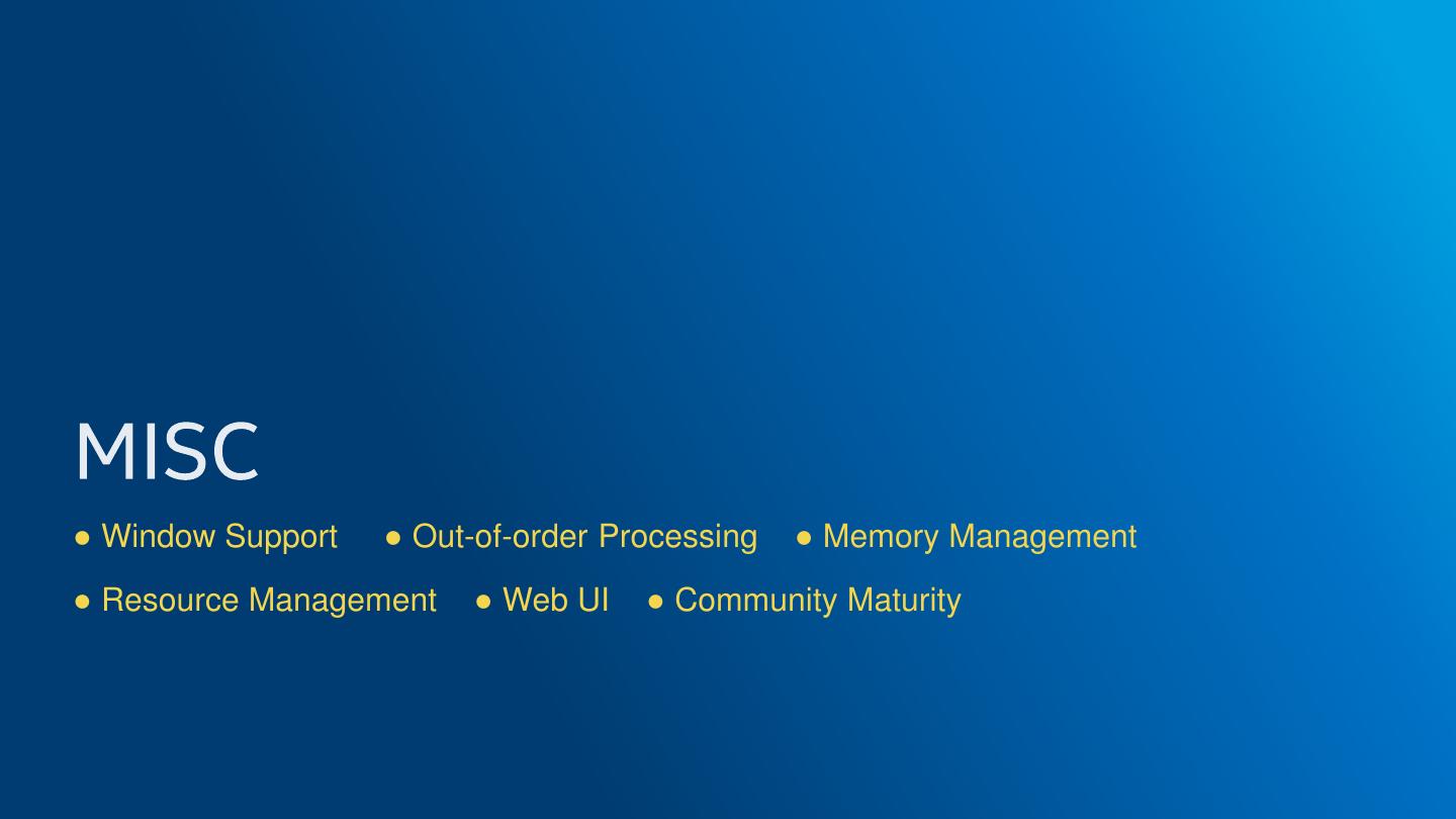 18 .● Window Support ● Out-of-order Processing ● Memory Management ● Resource Management ● Web UI ● Community Maturity