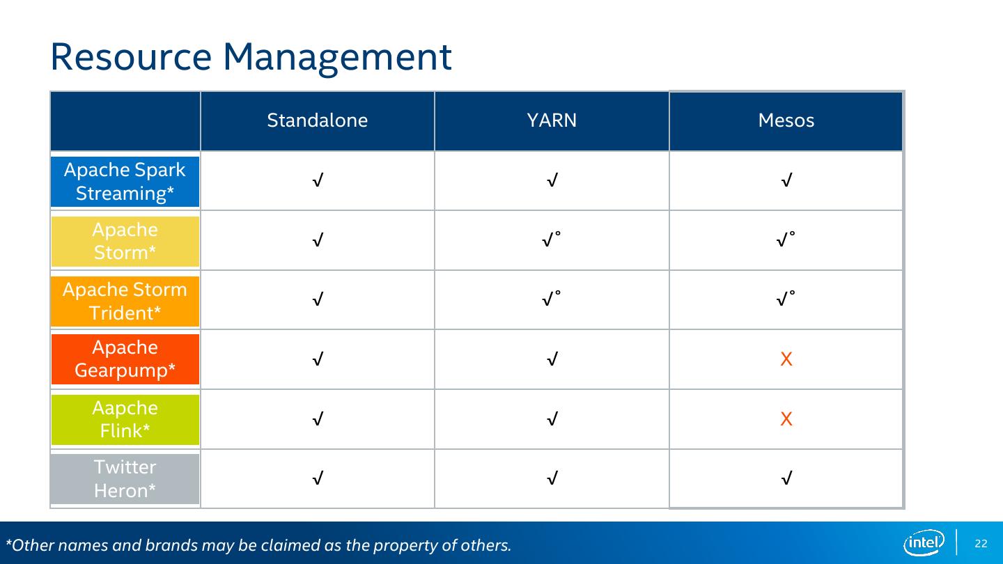 22 . Resource Management Standalone YARN Mesos Apache Spark √ √ √ Streaming* Apache √ √˚ √˚ Storm* Apache Storm √ √˚ √˚ Trident* Apache √ √ X Gearpump* Aapche √ √ X Flink* Twitter √ √ √ Heron* *Other names and brands may be claimed as the property of others. 22