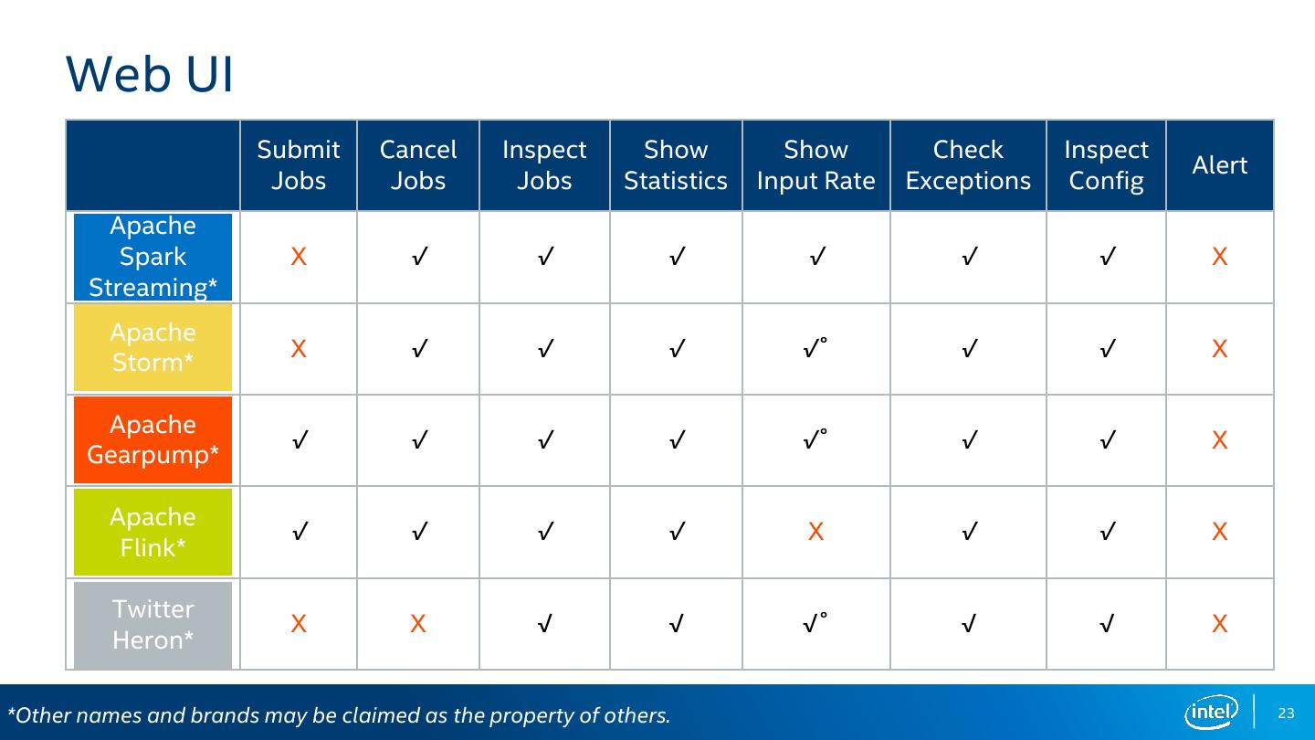 23 . Web UI Submit Cancel Inspect Show Show Check Inspect Alert Jobs Jobs Jobs Statistics Input Rate Exceptions Config Apache Spark X √ √ √ √ √ √ X Streaming* Apache X √ √ √ √˚ √ √ X Storm* Apache √ √ √ √ √˚ √ √ X Gearpump* Apache √ √ √ √ X √ √ X Flink* Twitter X X √ √ √˚ √ √ X Heron* *Other names and brands may be claimed as the property of others. 23