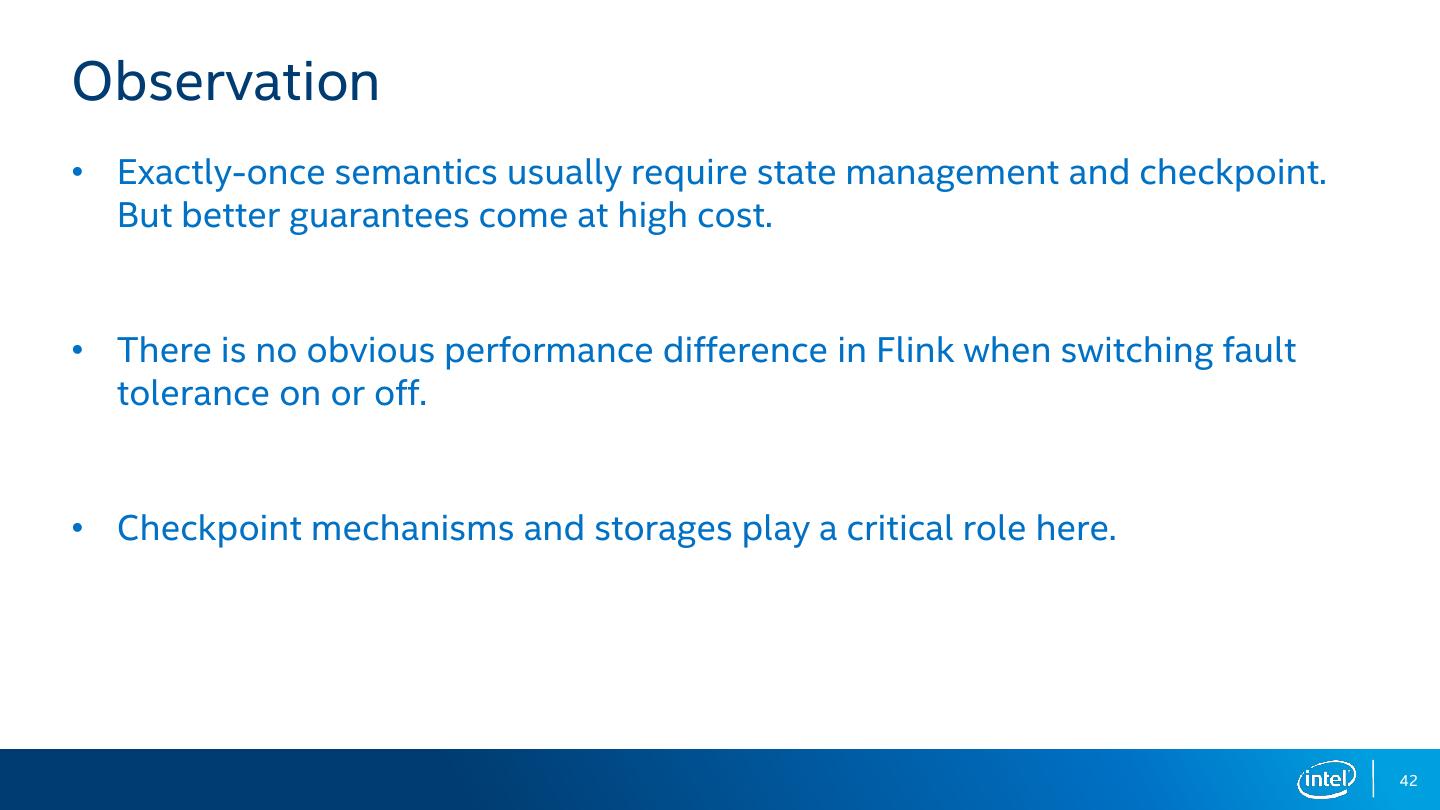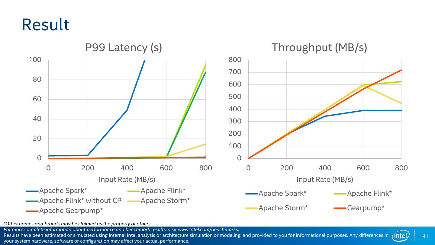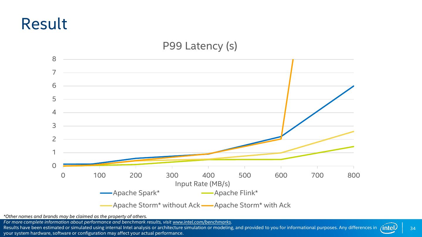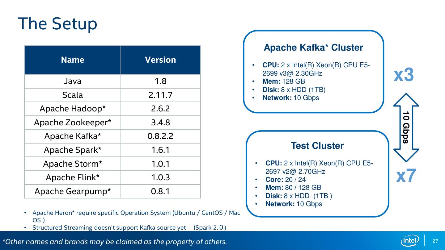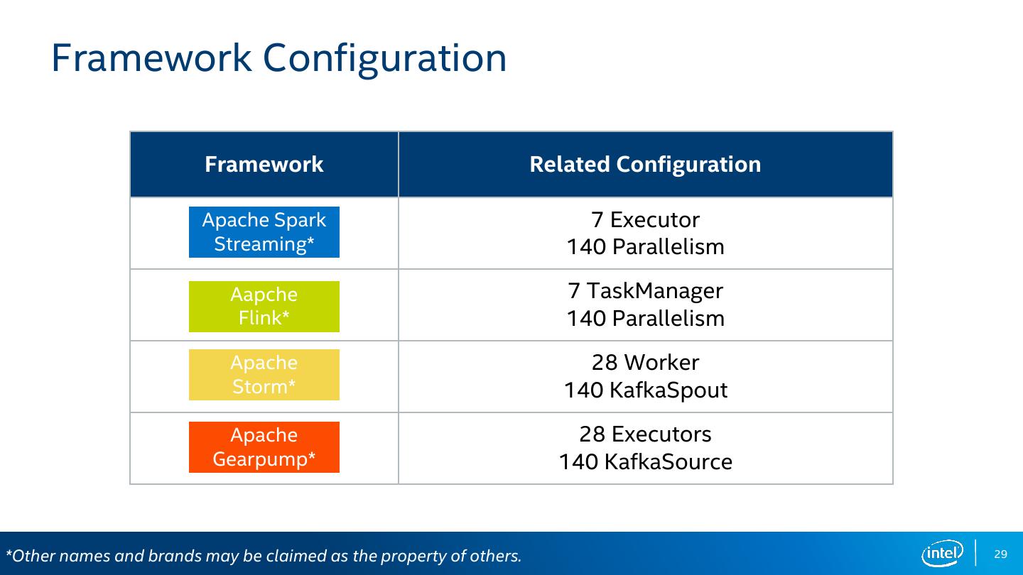 29 . Framework Configuration Framework Related Configuration Apache Spark 7 Executor Streaming* 140 Parallelism Aapche 7 TaskManager Flink* 140 Parallelism Apache 28 Worker Storm* 140 KafkaSpout Apache 28 Executors Gearpump* 140 KafkaSource *Other names and brands may be claimed as the property of others. 29