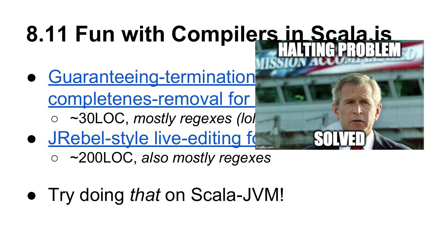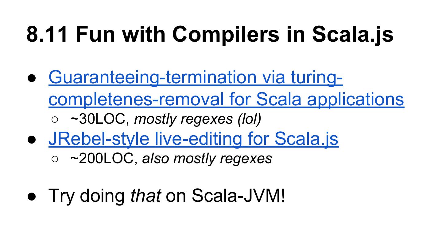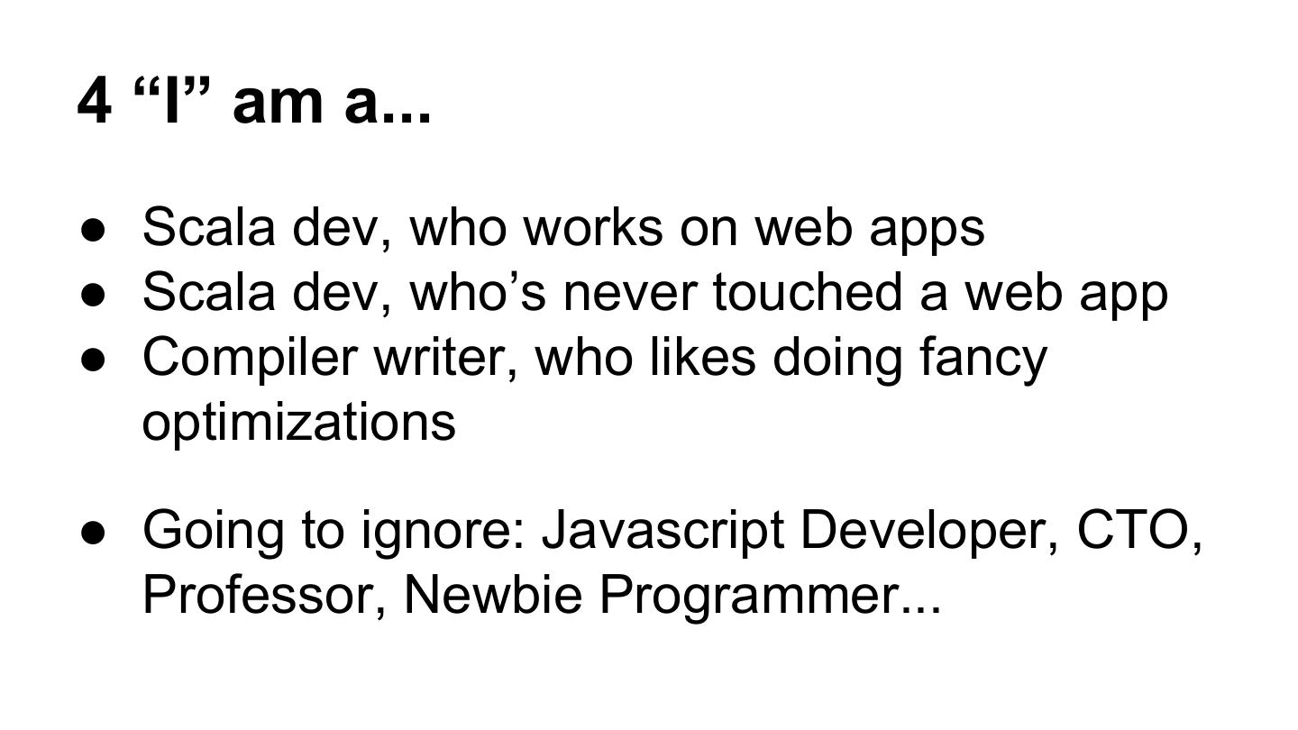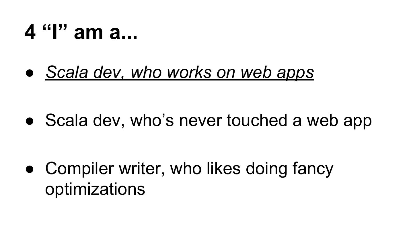 10 .4 “I” am a... ● Scala dev, who works on web apps ● Scala dev, who’s never touched a web app ● Compiler writer, who likes doing fancy optimizations