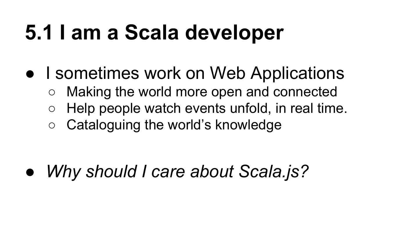 11 .5.1 I am a Scala developer ● I sometimes work on Web Applications ○ Making the world more open and connected ○ Help people watch events unfold, in real time. ○ Cataloguing the world’s knowledge ● Why should I care about Scala.js?