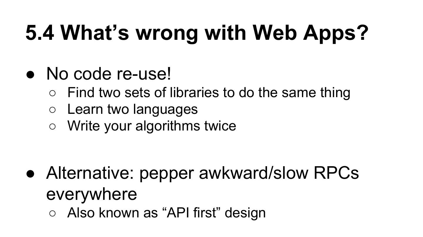 14 .5.4 What’s wrong with Web Apps? ● No code re-use! ○ Find two sets of libraries to do the same thing ○ Learn two languages ○ Write your algorithms twice ● Alternative: pepper awkward/slow RPCs everywhere ○ Also known as “API first” design