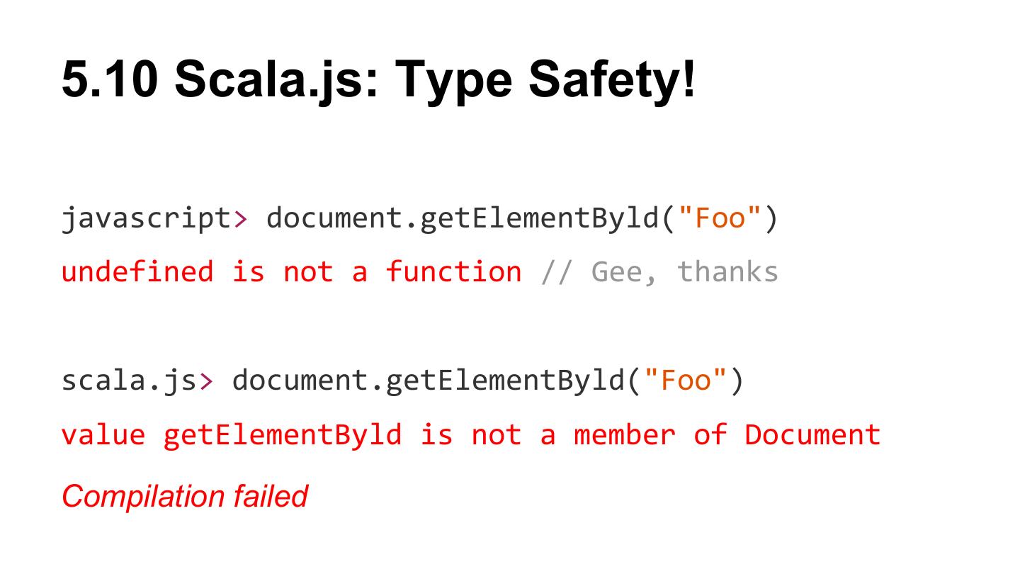 21 .5.10 Scala.js: Type Safety! javascript> document.getElementByld("Foo")