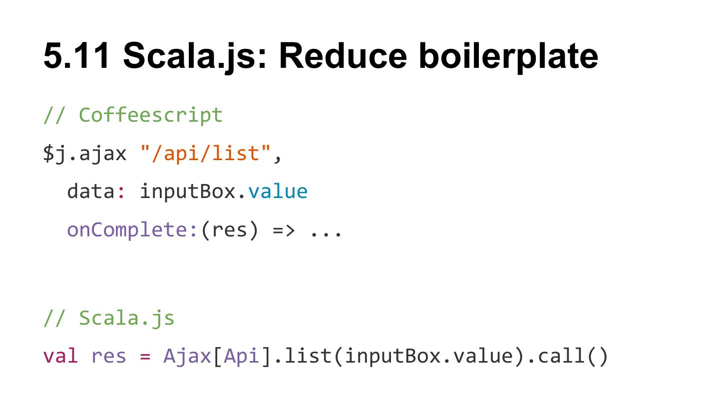 26 .5.11 Scala.js: Reduce boilerplate // Coffeescript $j.ajax "/api/list", data: inputBox.value onComplete: (res) => ...