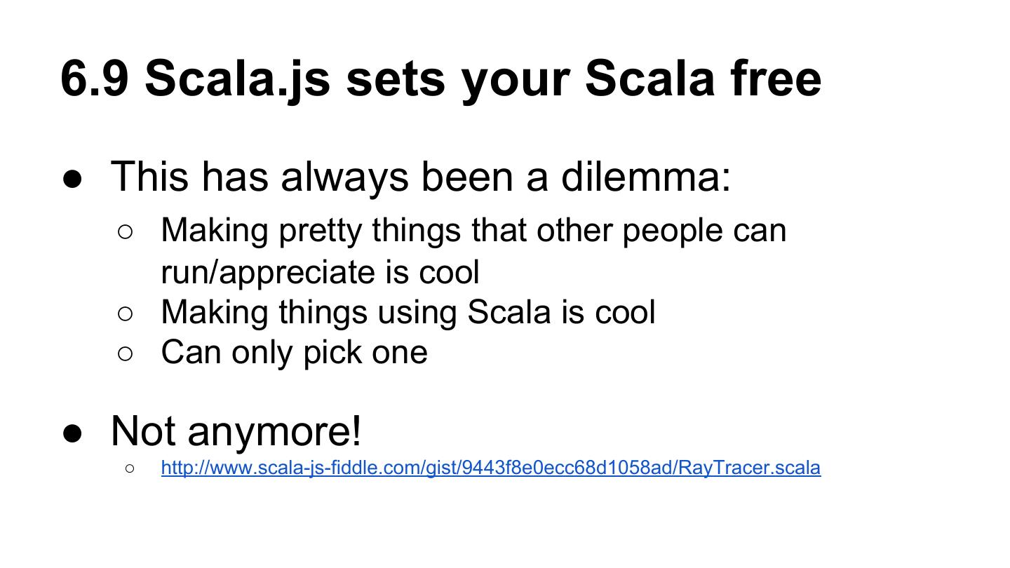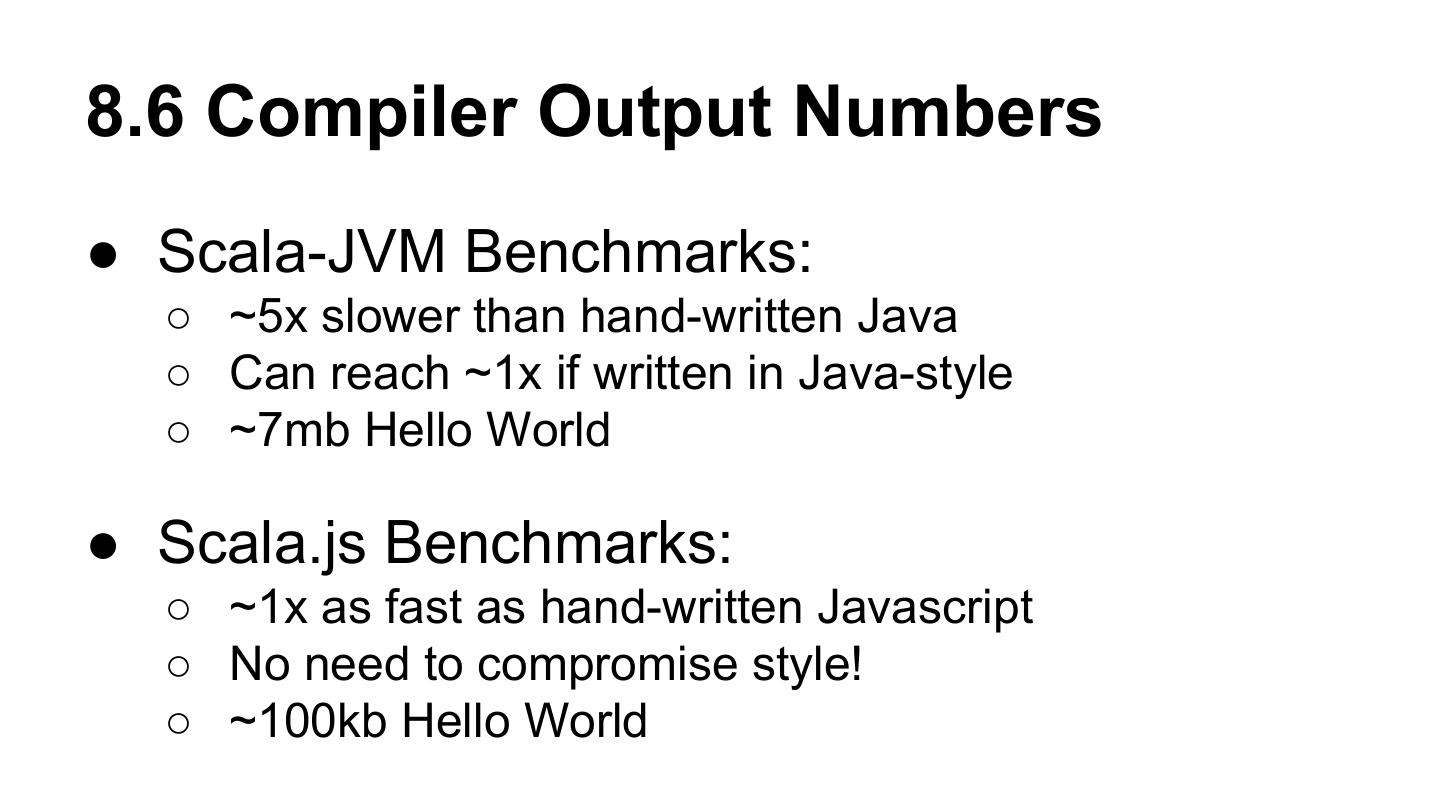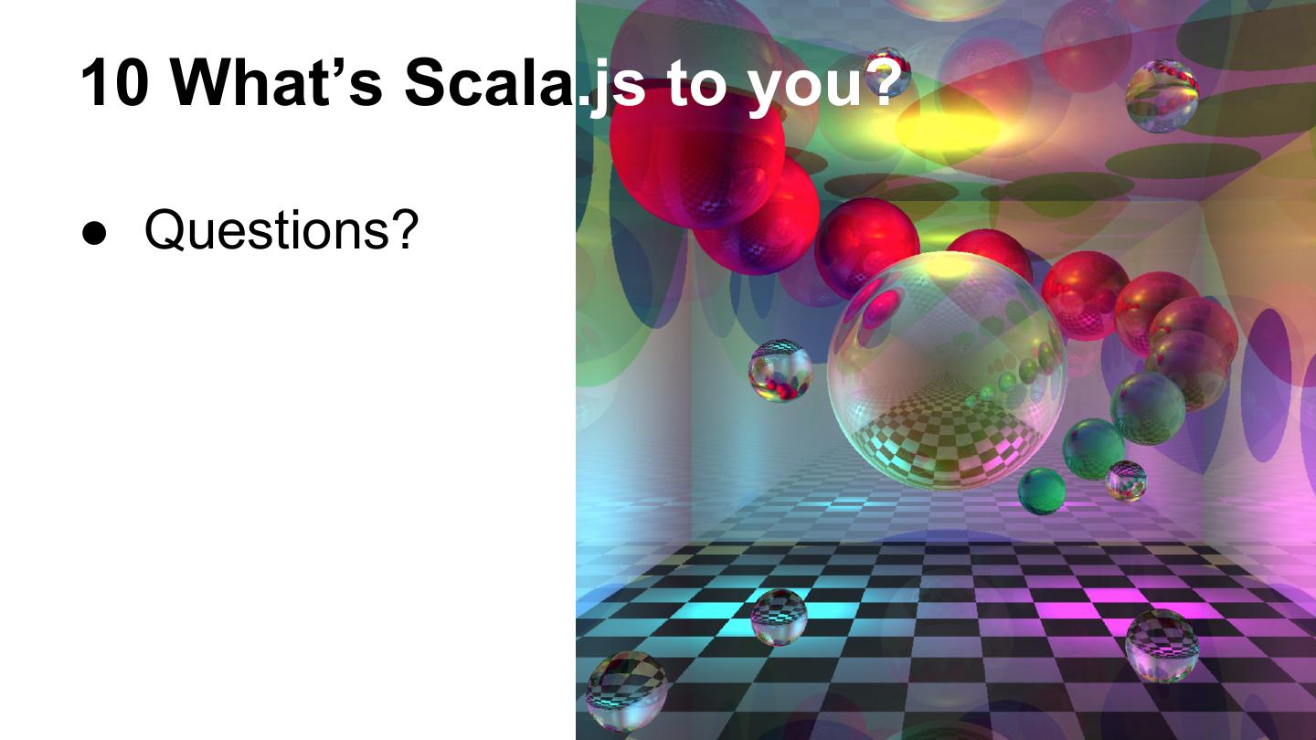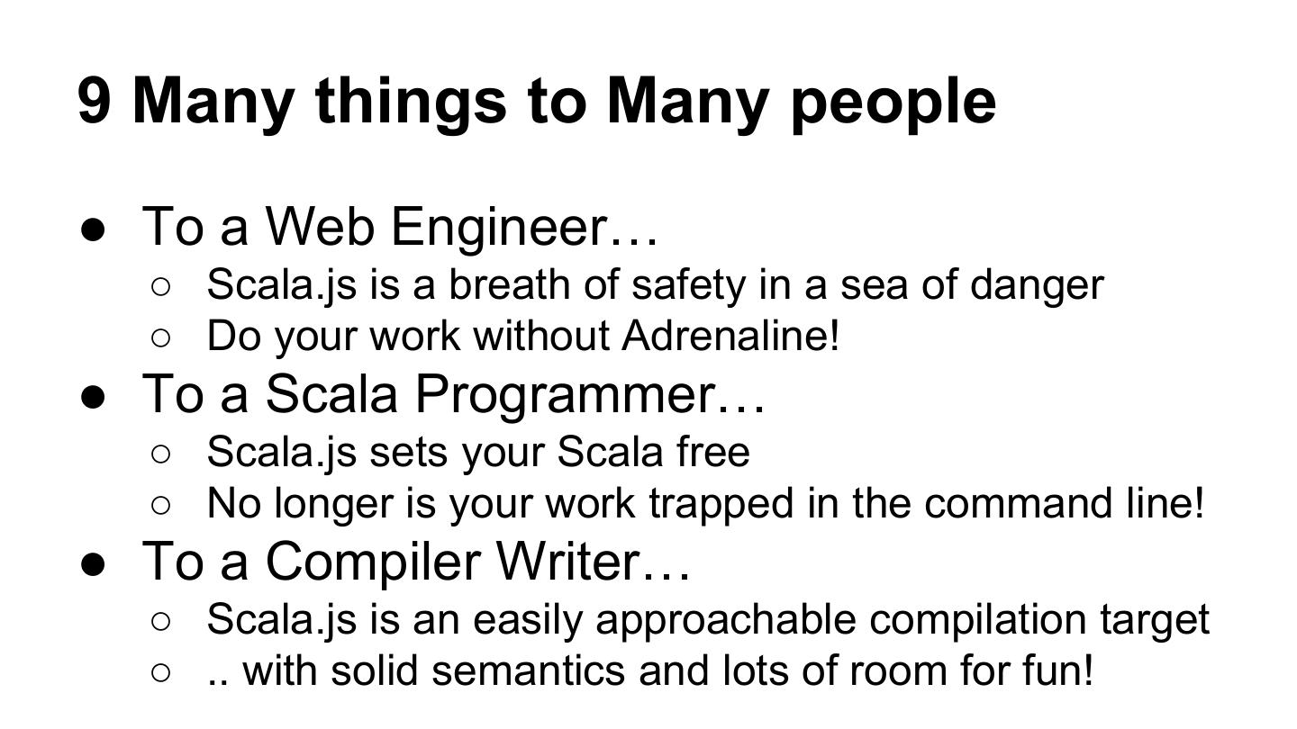 9 .4 “I” am a... ● Scala dev, who works on web apps ● Scala dev, who’s never touched a web app ● Compiler writer, who likes doing fancy optimizations ● Going to ignore: Javascript Developer, CTO, Professor, Newbie Programmer...