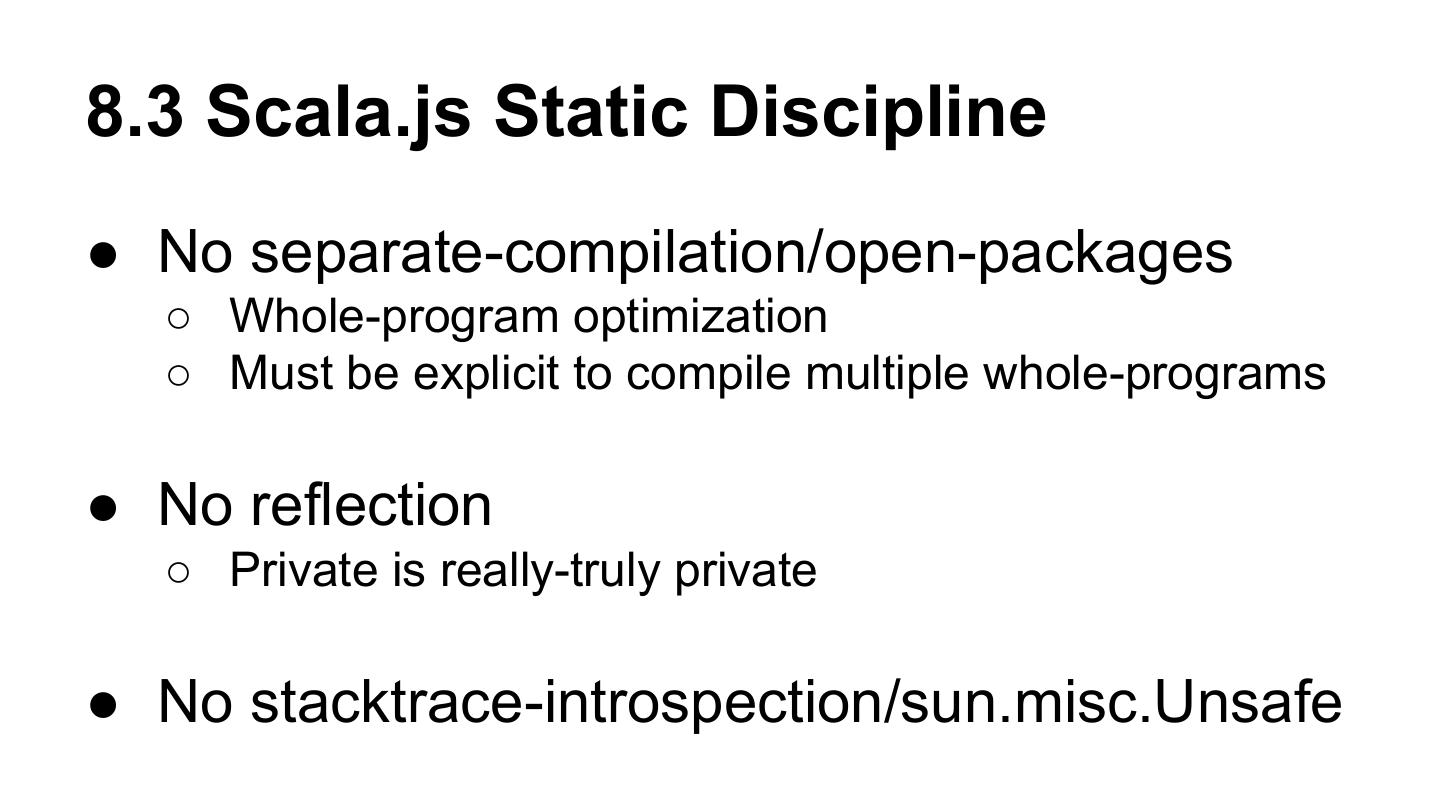 23 .5.10 Scala.js: Type Safety! javascript> document.getElementByld("Foo") undefined is not a function // Gee, thanks scala.js> document.getElementByld("Foo") value getElementByld is not a member of Document Compilation failed