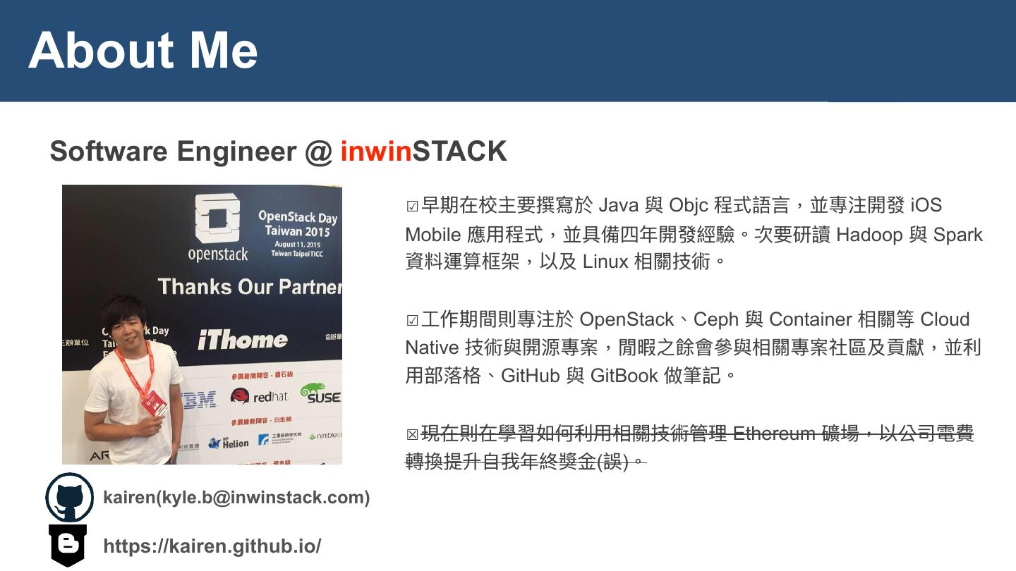 2 .About Me Software Engineer @ inwinSTACK ☑早期在校主要撰寫於 Java 與 Objc 程式語⾔言,並專注開發 iOS Mobile 應⽤用程式,並具備四年年開發經驗。次要研讀 Hadoop 與 Spark 資料運算框架,以及 Linux 相關技術。 ☑⼯工作期間則專注於 OpenStack、Ceph 與 Container 相關等 Cloud Native 技術與開源專案,閒暇之餘會參參與相關專案社區及貢獻,並利利 ⽤用部落落格、GitHub 與 GitBook 做筆記。 ☒現在則在學習如何利利⽤用相關技術管理理 Ethereum 礦場,以公司電費 轉換提升⾃自我年年終獎⾦金金(誤)。 kairen(kyle.b@inwinstack.com) https://kairen.github.io/