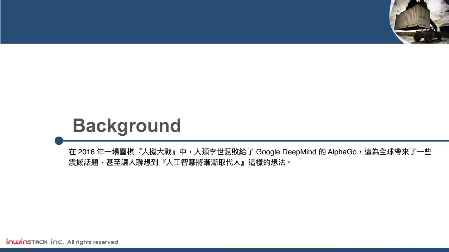 4 .Background 在 2016 年年⼀一場圍棋『⼈人機⼤大戰』中,⼈人類李世乭敗給了了 Google DeepMind 的 AlphaGo,這為全球帶來來了了⼀一些 震撼話題,甚⾄至讓⼈人聯聯想到『⼈人⼯工智慧將漸漸取代⼈人』這樣的想法。