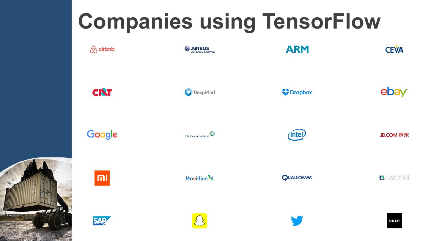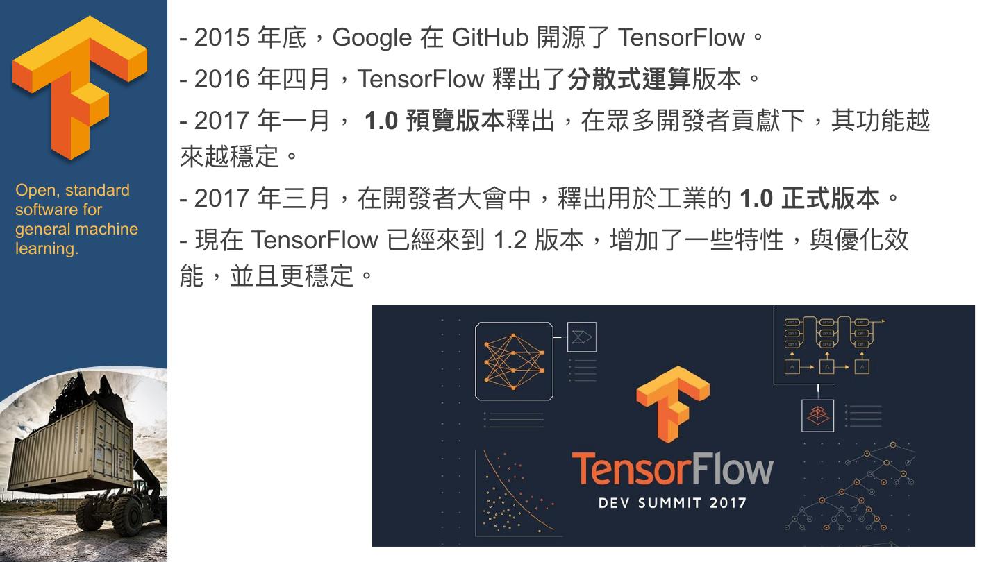18 . - 2015 年年底,Google 在 GitHub 開源了了 TensorFlow。 - 2016 年年四⽉月,TensorFlow 釋出了了分散式運算版本。 - 2017 年年⼀一⽉月, 1.0 預覽版本釋出,在眾多開發者貢獻下,其功能越 來來越穩定。 Open, standard software for - 2017 年年三⽉月,在開發者⼤大會中,釋出⽤用於⼯工業的 1.0 正式版本。 general machine learning. - 現在 TensorFlow 已經來來到 1.2 版本,增加了了⼀一些特性,與優化效 能,並且更更穩定。