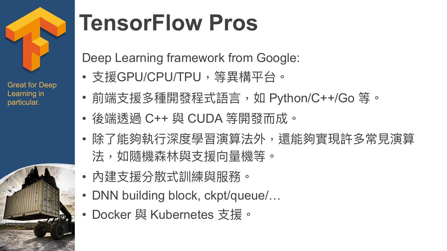 19 . TensorFlow Pros Deep Learning framework from Google: • ⽀支援GPU/CPU/TPU,等異異構平台。 Great for Deep Learning in particular. • 前端⽀支援多種開發程式語⾔言,如 Python/C++/Go 等。 • 後端透過 C++ 與 CUDA 等開發⽽而成。 • 除了了能夠執⾏行行深度學習演算法外,還能夠實現許多常⾒見見演算 法,如隨機森林林與⽀支援向量量機等。 • 內建⽀支援分散式訓練與服務。 • DNN building block, ckpt/queue/… • Docker 與 Kubernetes ⽀支援。