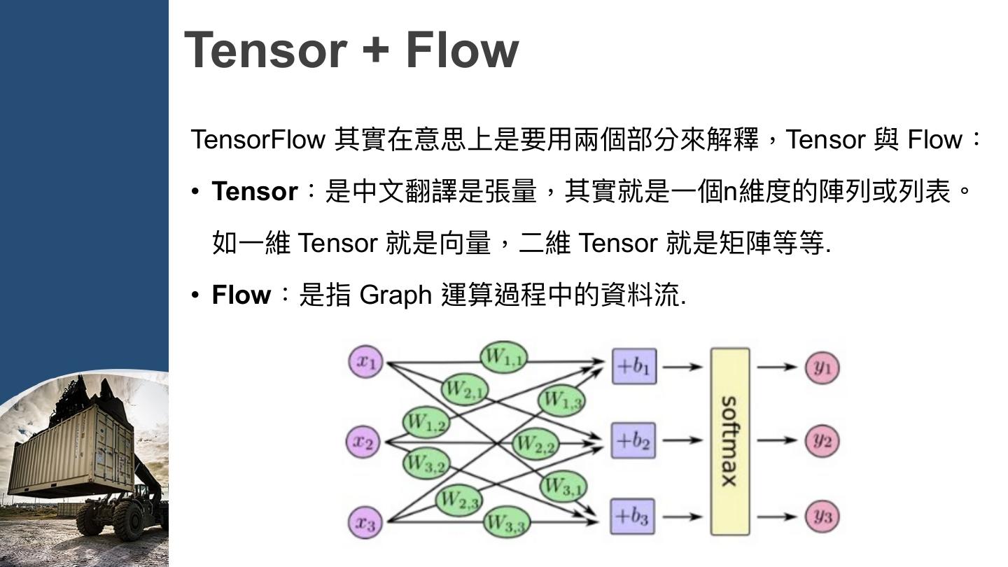 23 .Tensor + Flow TensorFlow 其實在意思上是要⽤用兩兩個部分來來解釋,Tensor 與 Flow: • Tensor:是中⽂文翻譯是張量量,其實就是⼀一個n維度的陣列列或列列表。 如⼀一維 Tensor 就是向量量,⼆二維 Tensor 就是矩陣等等. • Flow:是指 Graph 運算過程中的資料流.