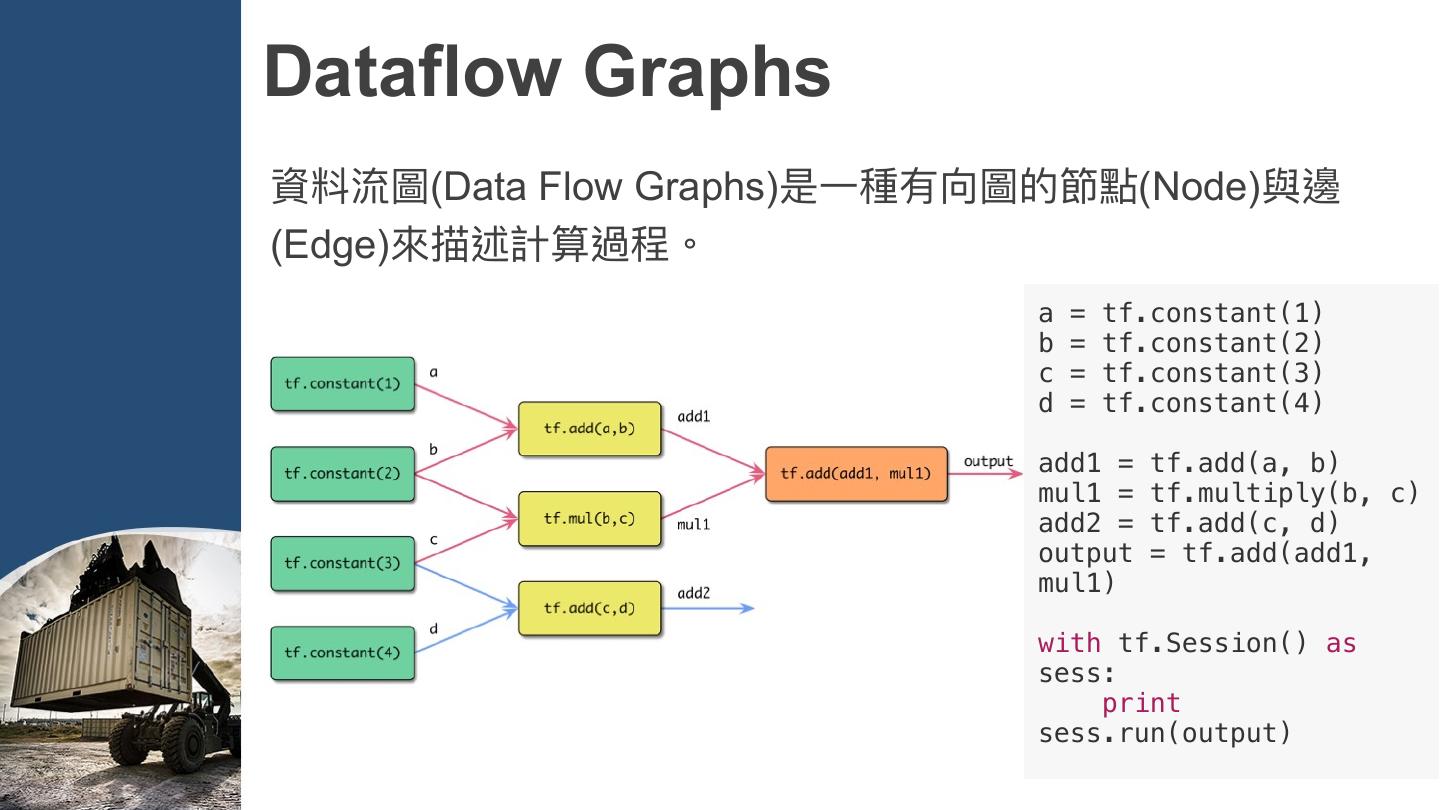 24 .Dataflow Graphs 資料流圖(Data Flow Graphs)是⼀一種有向圖的節點(Node)與邊 (Edge)來來描述計算過程。 a = tf.constant(1) b = tf.constant(2) c = tf.constant(3) d = tf.constant(4) add1 = tf.add(a, b) mul1 = tf.multiply(b, c) add2 = tf.add(c, d) output = tf.add(add1, mul1) with tf.Session() as sess: print sess.run(output)