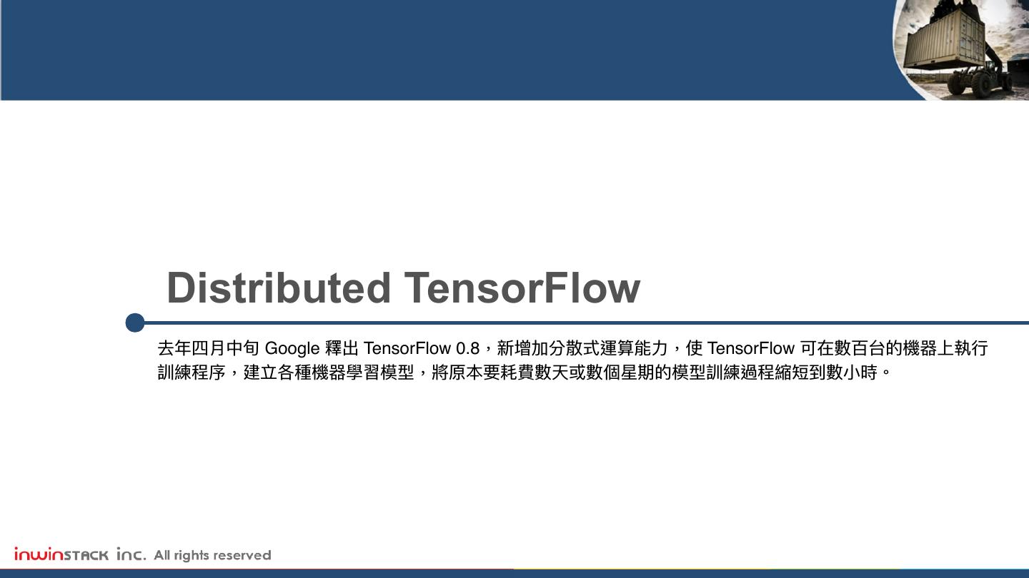 26 .Distributed TensorFlow 去年年四⽉月中旬 Google 釋出 TensorFlow 0.8,新增加分散式運算能⼒力力,使 TensorFlow 可在數百台的機器上執⾏行行 訓練程序,建立各種機器學習模型,將原本要耗費數天或數個星期的模型訓練過程縮短到數⼩小時。