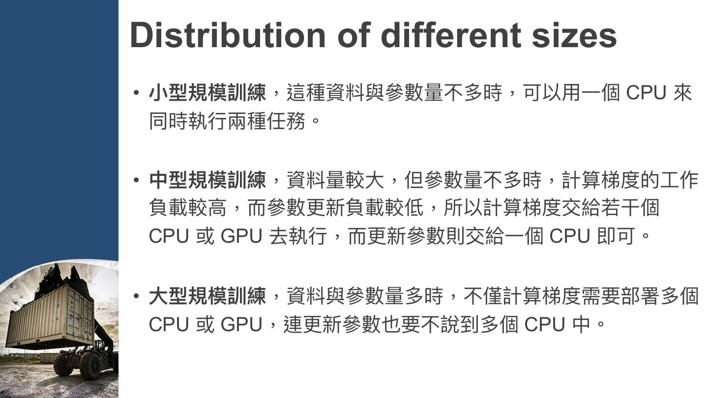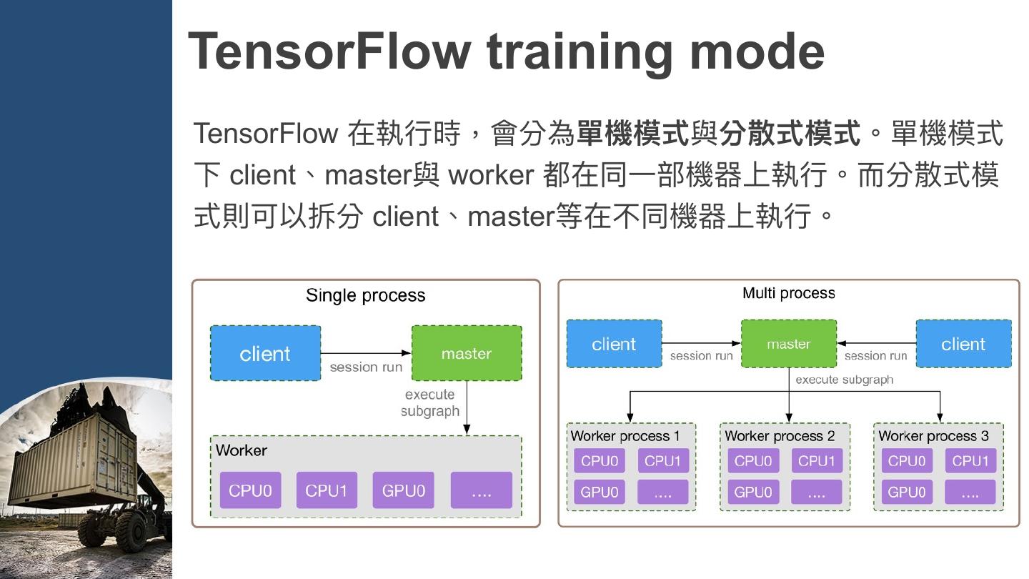 28 .TensorFlow training mode TensorFlow 在執⾏行行時,會分為單機模式與分散式模式。單機模式 下 client、master與 worker 都在同⼀一部機器上執⾏行行。⽽而分散式模 式則可以拆分 client、master等在不同機器上執⾏行行。