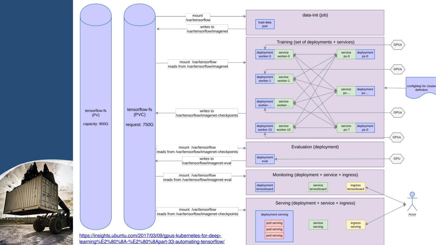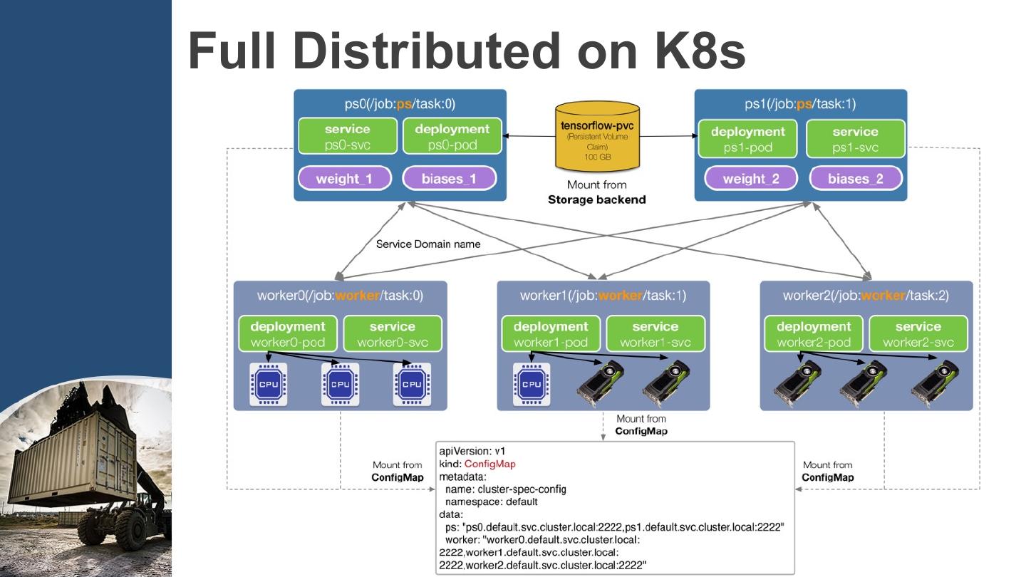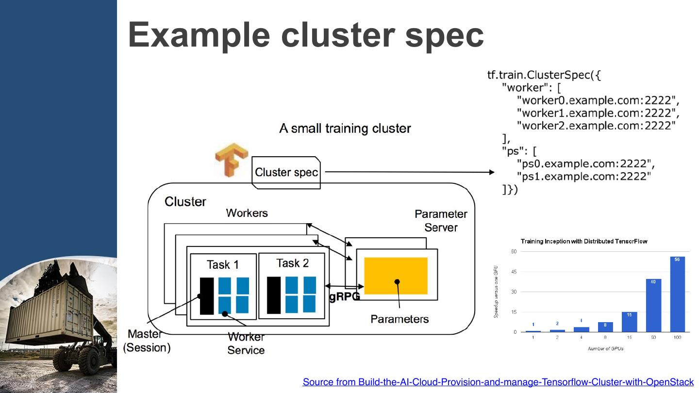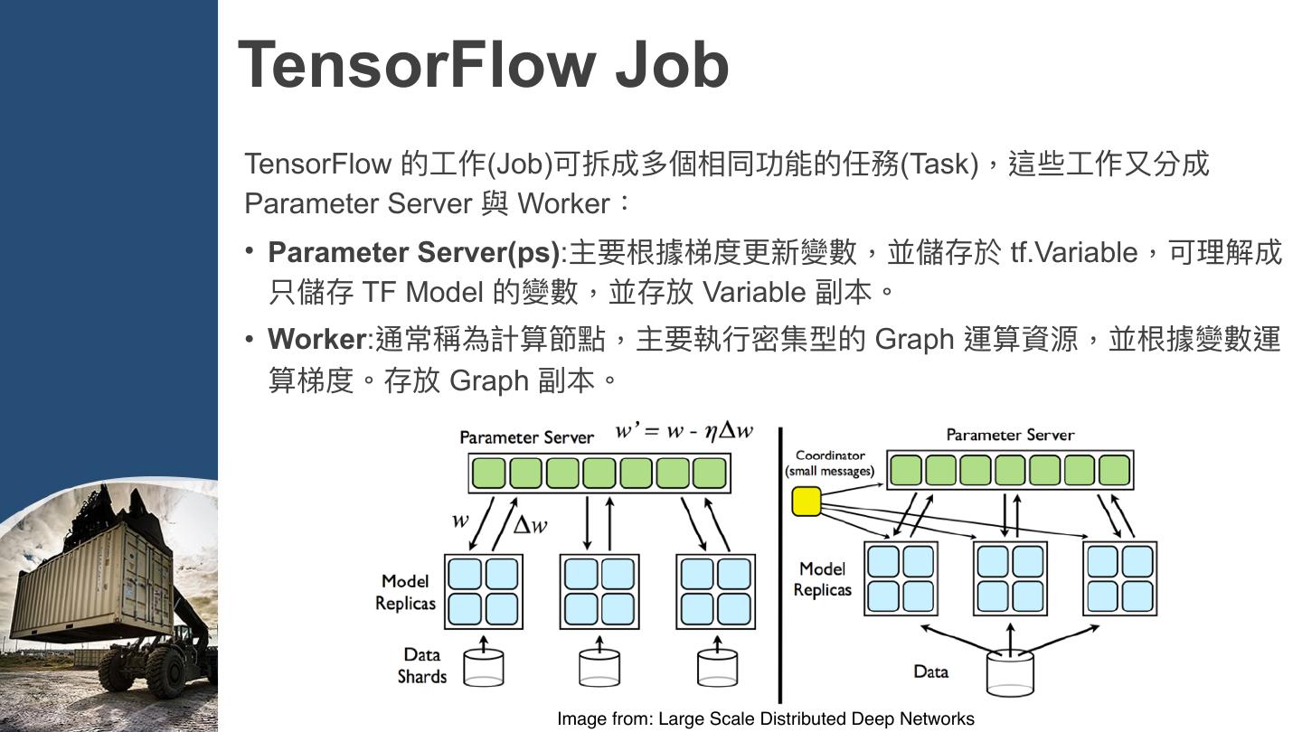 29 .TensorFlow Job TensorFlow 的⼯工作(Job)可拆成多個相同功能的任務(Task),這些⼯工作⼜又分成 Parameter Server 與 Worker: • Parameter Server(ps):主要根據梯度更更新變數,並儲存於 tf.Variable,可理理解成 只儲存 TF Model 的變數,並存放 Variable 副本。 • Worker:通常稱為計算節點,主要執⾏行行密集型的 Graph 運算資源,並根據變數運 算梯度。存放 Graph 副本。 Image from: Large Scale Distributed Deep Networks