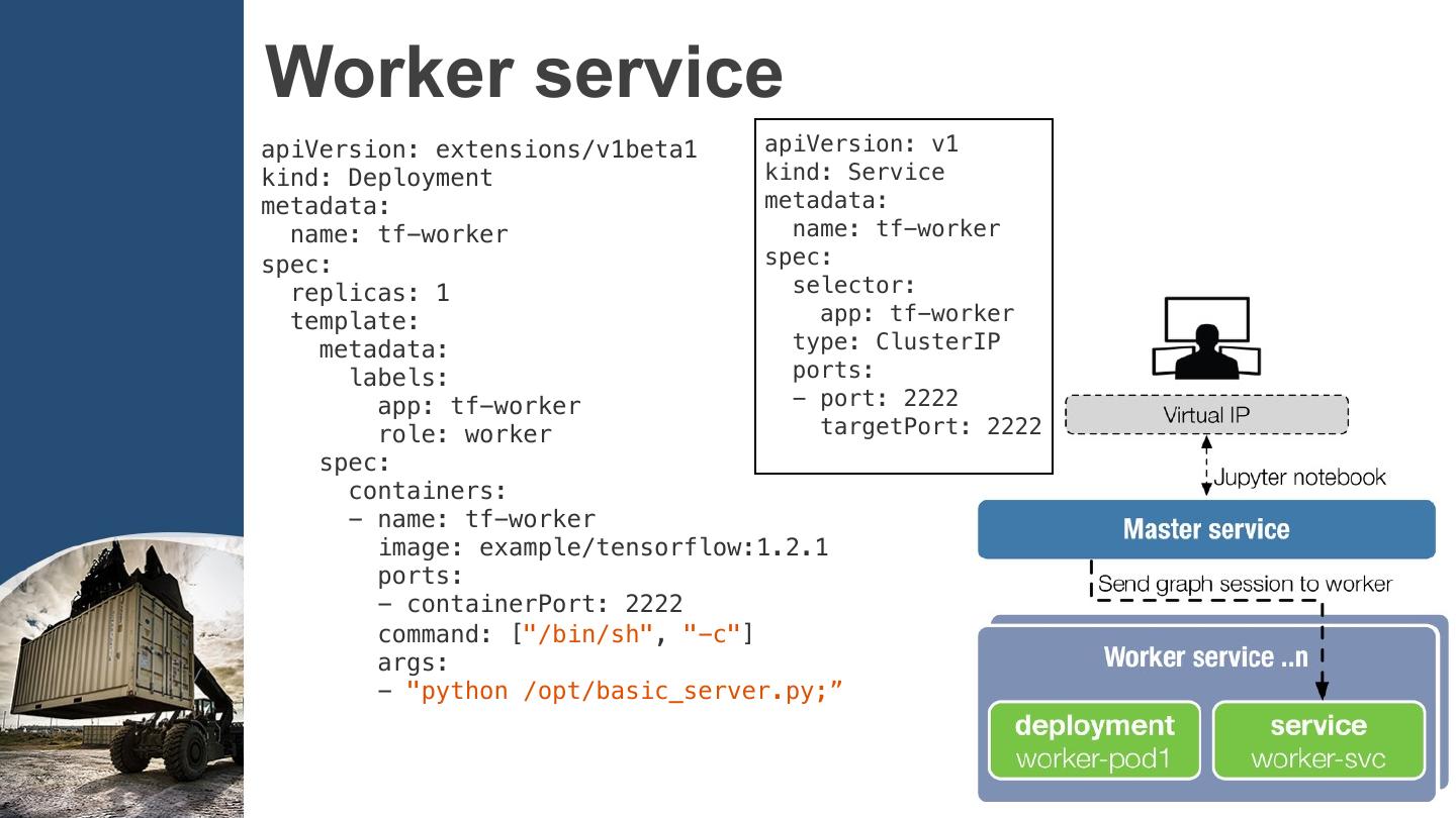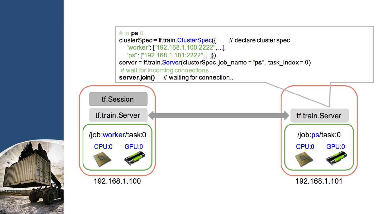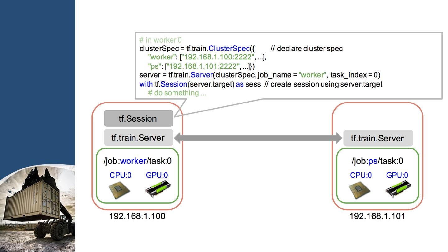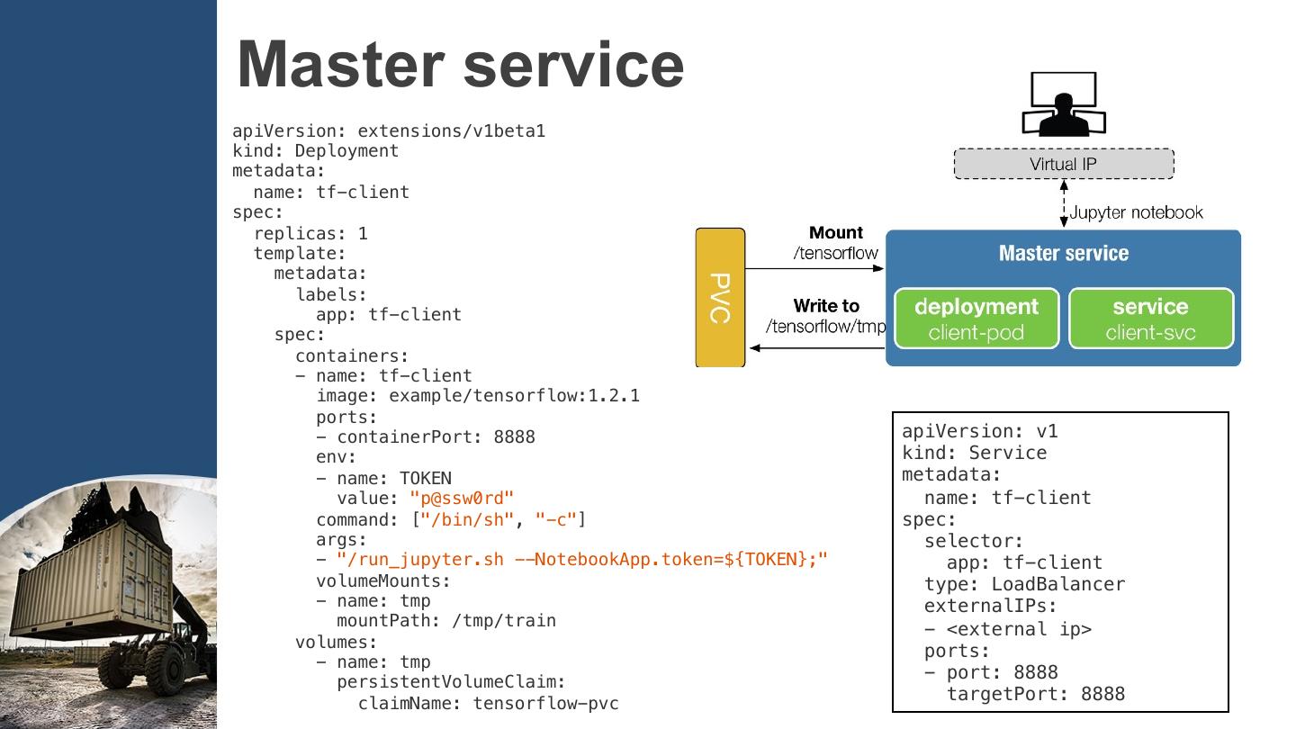 29 .TensorFlow Job TensorFlow 的⼯工作(Job)可拆成多個相同功能的任務(Task),這些⼯工作⼜又分成 Parameter Server 與 Worker: • Parameter Server(ps):主要根據梯度更更新變數,並儲存於 tf.Variable,可理理解成 只儲存 TF Model 的變數,並存放 Variable 副本。 • Worker:通常稱為計算節點,主要執⾏行行密集型的 Graph 運算資源,並根據變數運 算梯度。存放 Graph 副本。 Image from: Large Scale Distributed Deep Networks