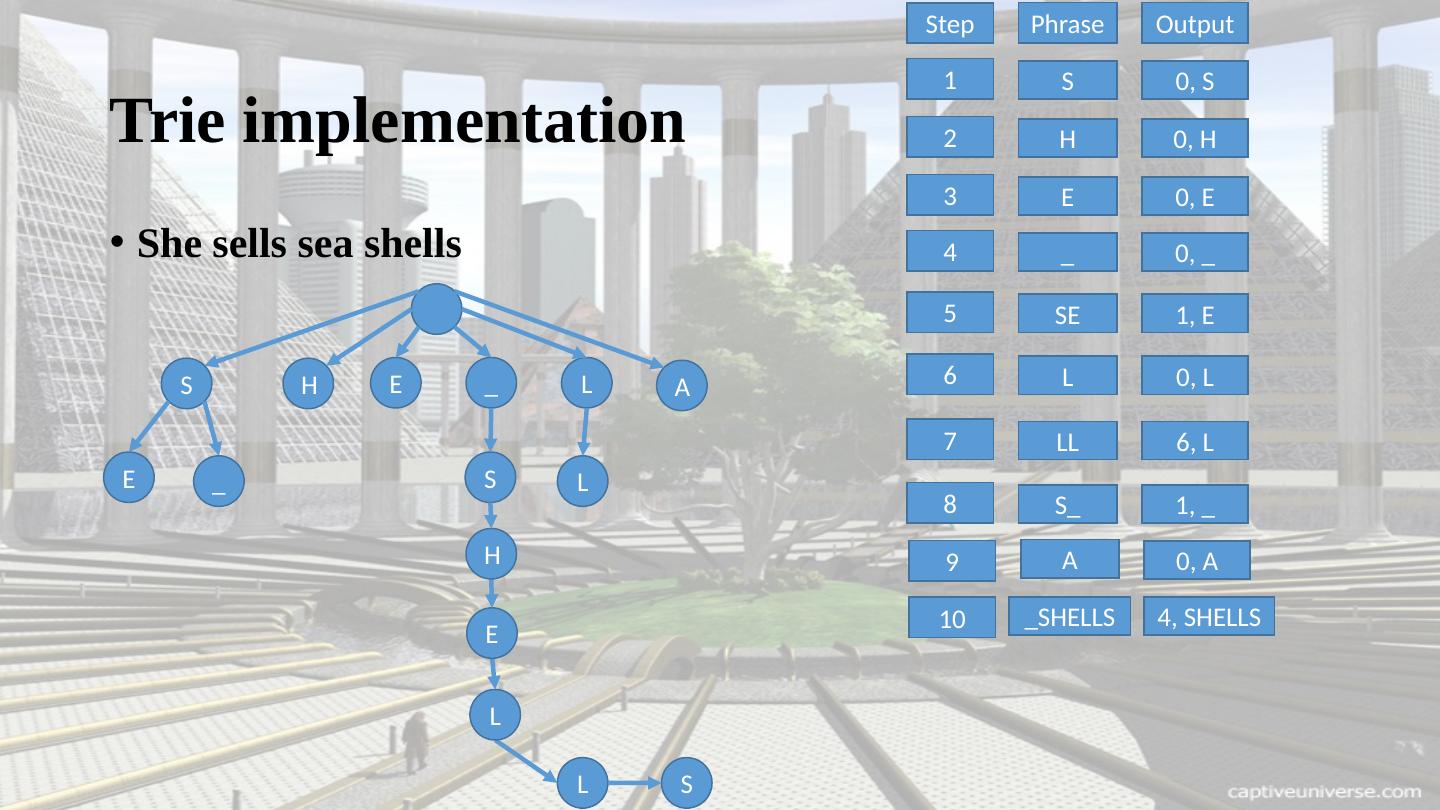 10 .Trie implementation She sells sea shells S H E _ L S _ E A Step Phrase Output 1 S 0, S 2 H 0, H 3 E 0, E 4 _ 0, _ 5 SE 1 , E 6 L 0, L 7 LL 6, L 8 S_ 1, _ 9 A 0, A 10 _SHELLS 4, SHELLS L S E L L H