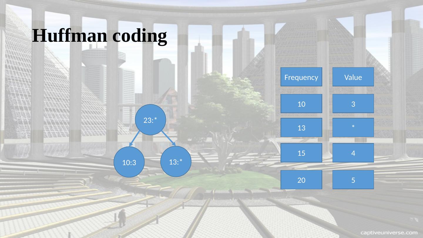 13 .Huffman coding Frequency Value 10 3 15 4 20 5 13 * 13:* 10:3 2 3:*