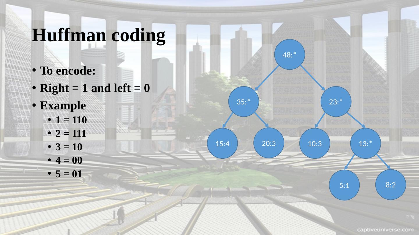 17 .Huffman coding To encode: Right = 1 and left = 0 Example 1 = 110 2 = 111 3 = 10 4 = 00 5 = 01 8:2 5:1 13:* 10:3 2 3:* 20:5 15:4 35:* 48:*