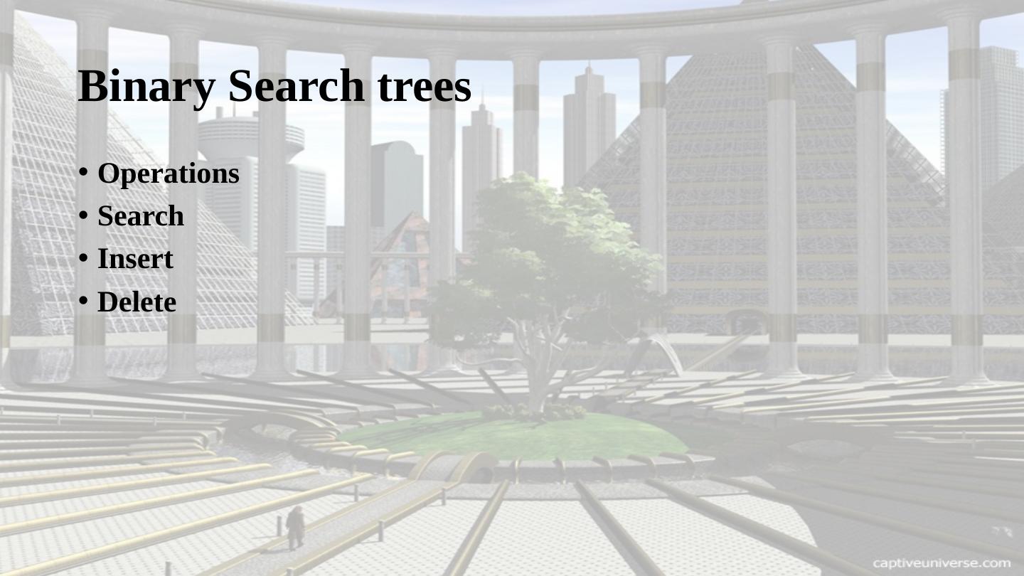 20 .Binary Search trees Binary search tree and a binary tree In a binary search tree all nodes much have a label Delete and Insert needs a label as does create tree for the root Delete can break the tree Fix it downwards Insert must insert in sorted order