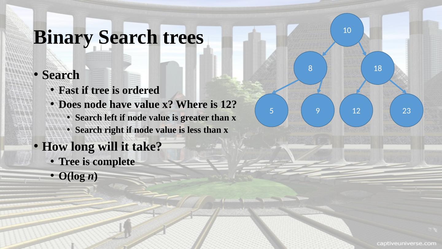 22 .Binary Search trees Search Fast if tree is ordered Does node have value x? Where is 12? Search left if node value is greater than x Search right if node value is less than x How long will it take? Tree is complete O(log n ) 10 8 18 5 9 12 23