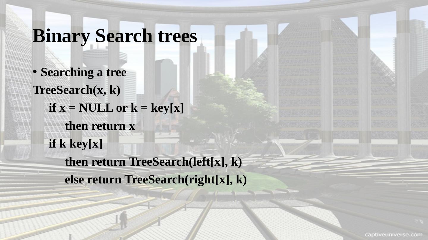 23 .Binary Search trees Searching a tree TreeSearch (x, k) if x = NULL or k = key[x] then return x if k key[x] then return TreeSearch (left[x], k) else return TreeSearch (right[x], k)