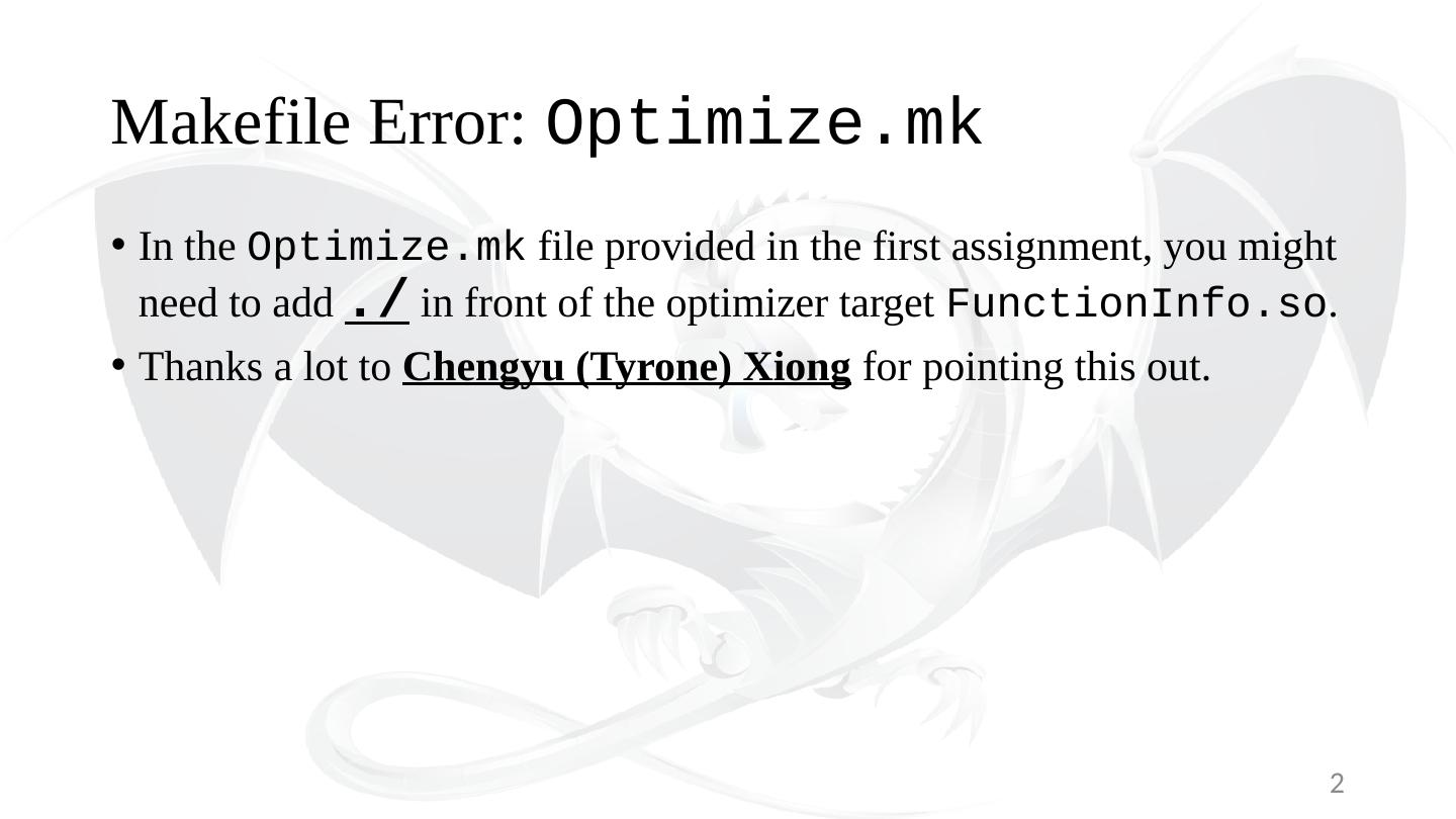 2 .Makefile Error: Optimize.mk In the Optimize.mk file provided in the first assignment, you might need to add ./ in front of the optimizer target FunctionInfo.so . Thanks a lot to Chengyu (Tyrone) Xiong for pointing this out. 2