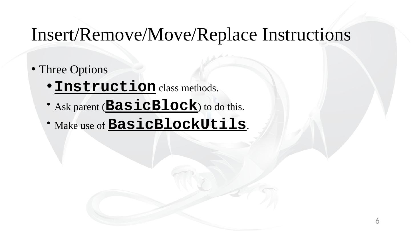6 .Insert/Remove/Move/Replace Instructions Three Options Instruction class methods. Ask parent ( BasicBlock ) to do this. Make use of BasicBlockUtils . 6