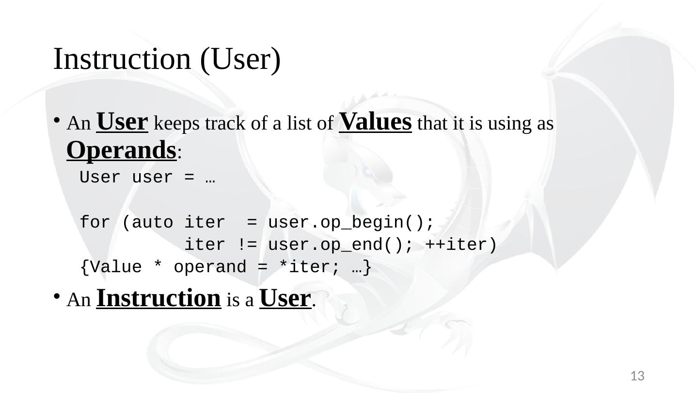 13 .Instruction (User) An User keeps track of a list of Values that it is using as Operands : User user = … for (auto iter = user.op_begin (); iter != user.op_end (); ++ iter ) {Value * operand = * iter ; …} An Instruction is a User . 13