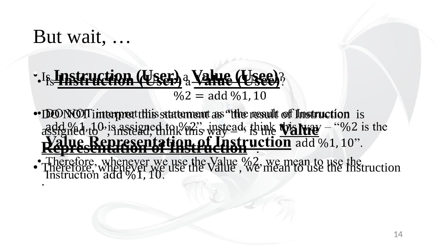 14 .But wait, … Is Instruction (User) a Value ( Usee ) ? DO NOT interpret this statement as “the result of Instruction is assigned to ”, instead, think this way – “ is the Value Representation of Instruction ”. Therefore, whenever we use the Value , we mean to use the Instruction . 14