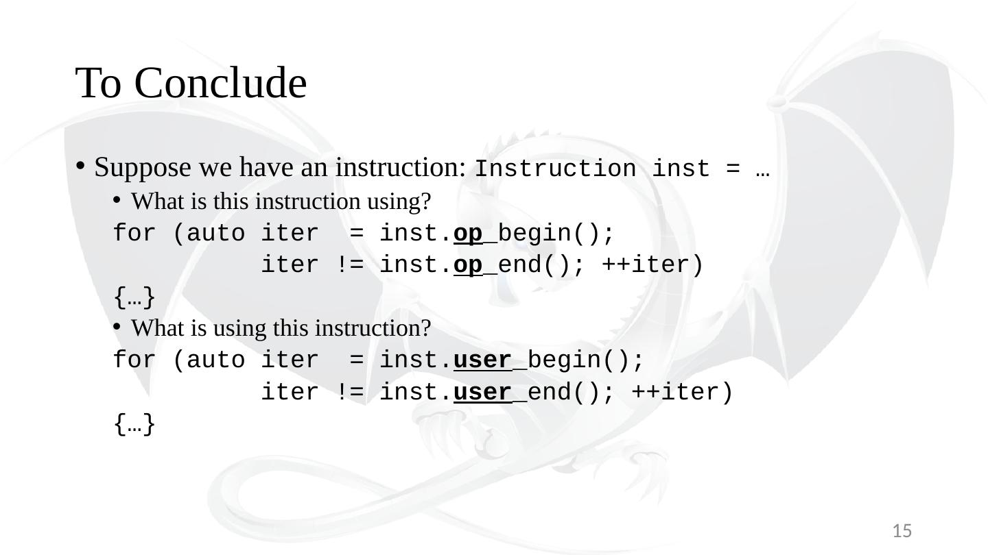 15 .To Conclude Suppose we have an instruction: Instruction inst = … What is this instruction using? for (auto iter = inst. op _begin (); iter != inst. op _end (); ++ iter ) {…} What is using this instruction? for (auto iter = inst. user _begin (); iter != inst. user _end (); ++ iter ) {…} 15