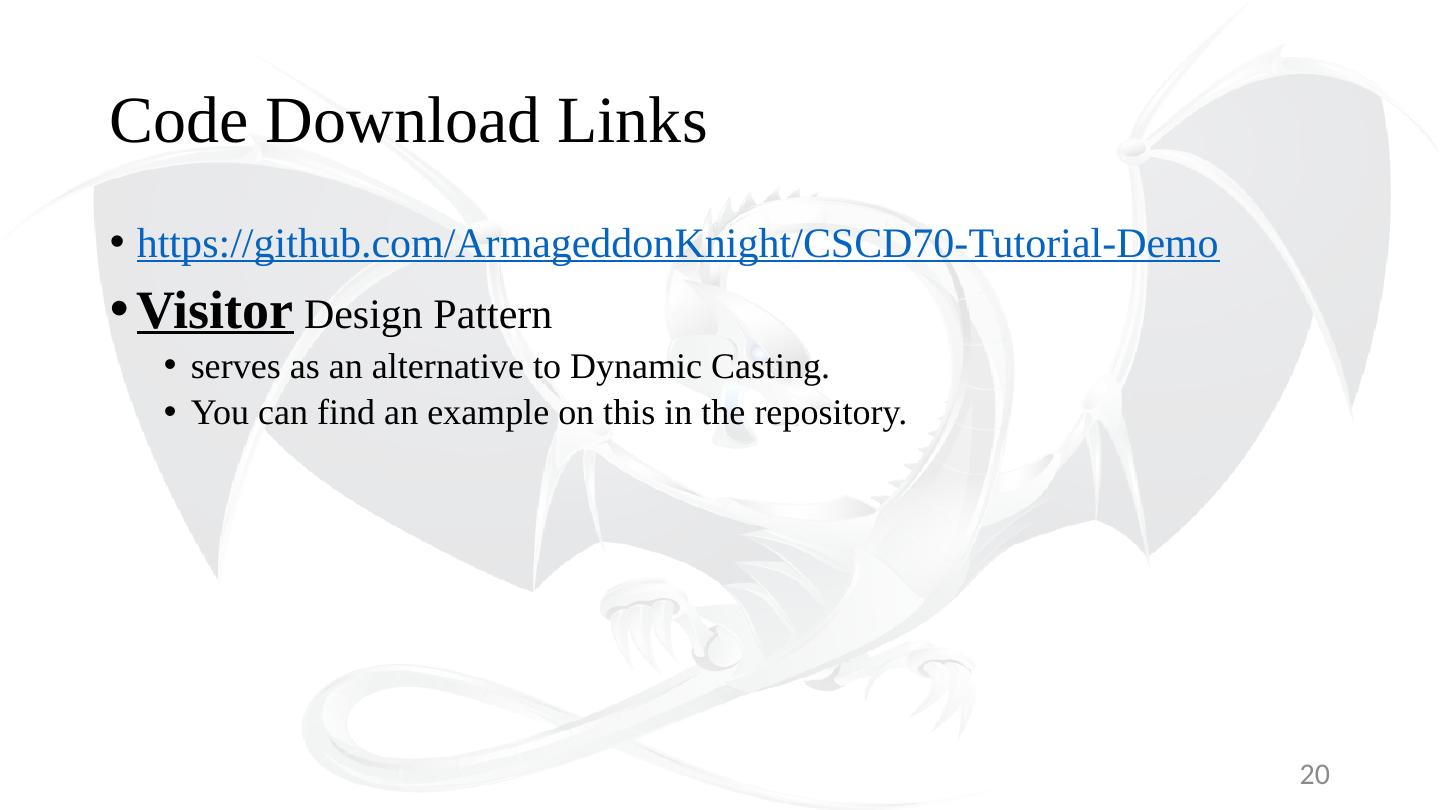 20 .Code Download Links https://github.com/ArmageddonKnight/CSCD70-Tutorial-Demo Visitor Design Pattern serves as an alternative to Dynamic Casting. You can find an example on this in the repository. 20