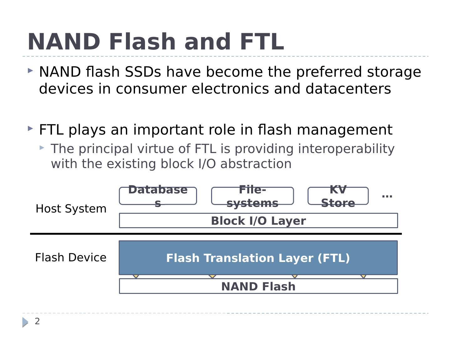 2 .NAND Flash and FTL 2 NAND flash SSDs have become the preferred storage devices in consumer electronics and datacenters FTL plays an important role in flash management The principal virtue of FTL is providing interoperability with the existing block I/O abstraction NAND Flash Databases File-systems KV Store Flash Device Host System … Block I/O Layer Overwriting restriction Limited P/E cycles Bad blocks Asymmetric I/O operation Flash Translation Layer (FTL)