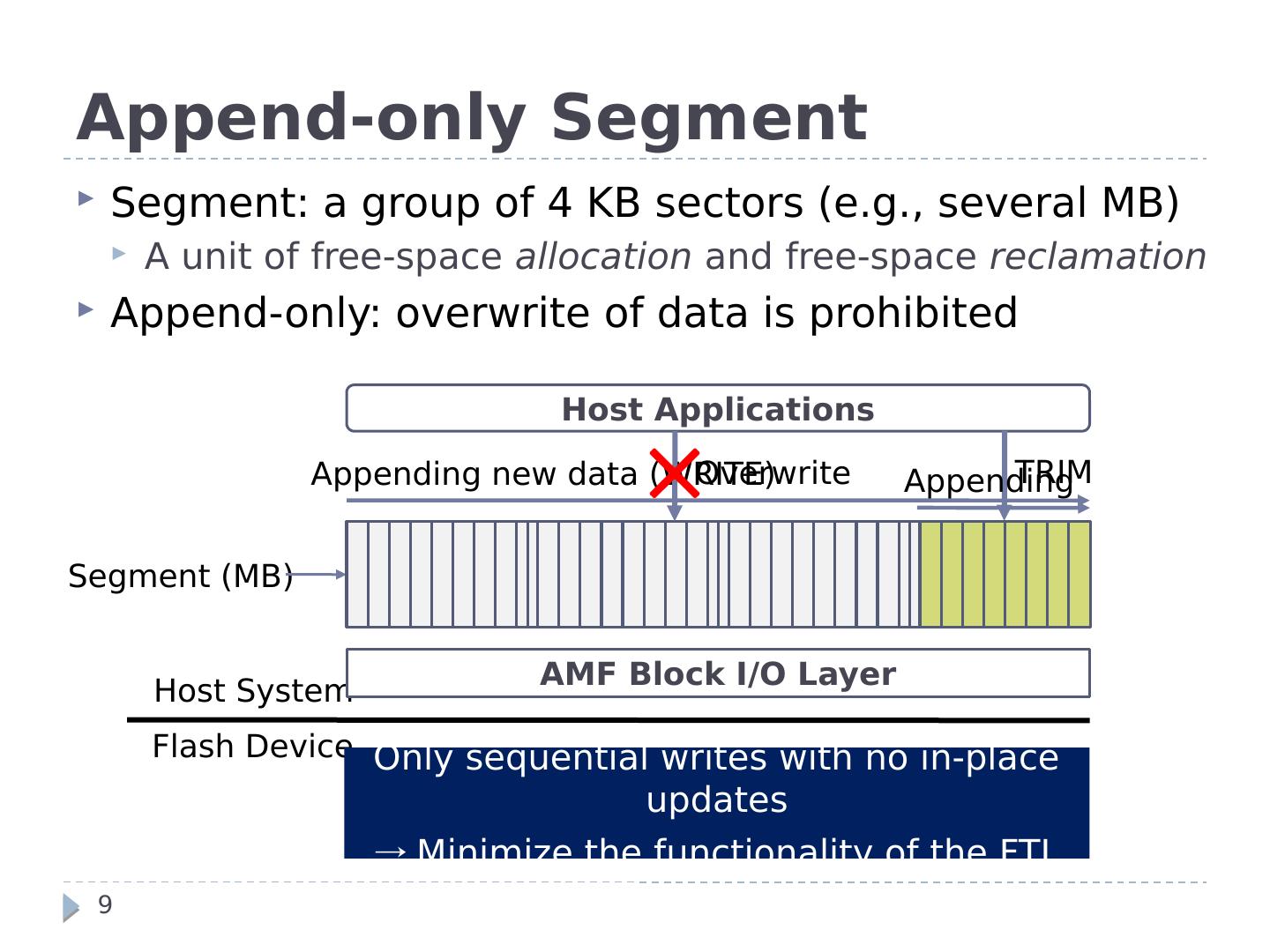 9 .Append-only Segment 9 Segment: a group of 4 KB sectors (e.g., several MB) A unit of free-space allocation and free-space reclamation Append-only: overwrite of data is prohibited Host Applications Host System AMF Block I/O Layer Flash Device … Segment (MB) Appending new data (WRITE) Overwrite TRIM Appending Only sequential writes with no in-place updates → Minimize the functionality of the FTL