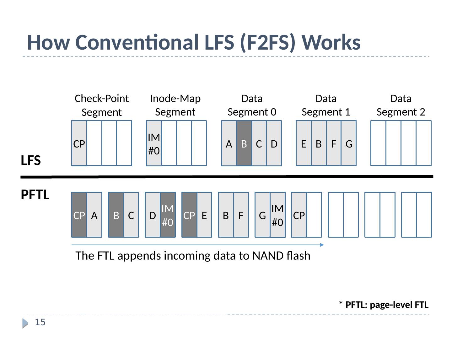 13 .How Conventional LFS (F2FS) Works 13 LFS PFTL Check-Point Segment Inode-Map Segment Data Segment 0 Data Segment 1 Data Segment 2 Segment Block with 2 pages * PFTL: page-level FTL